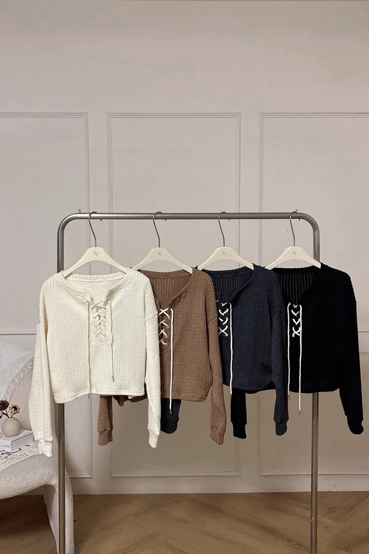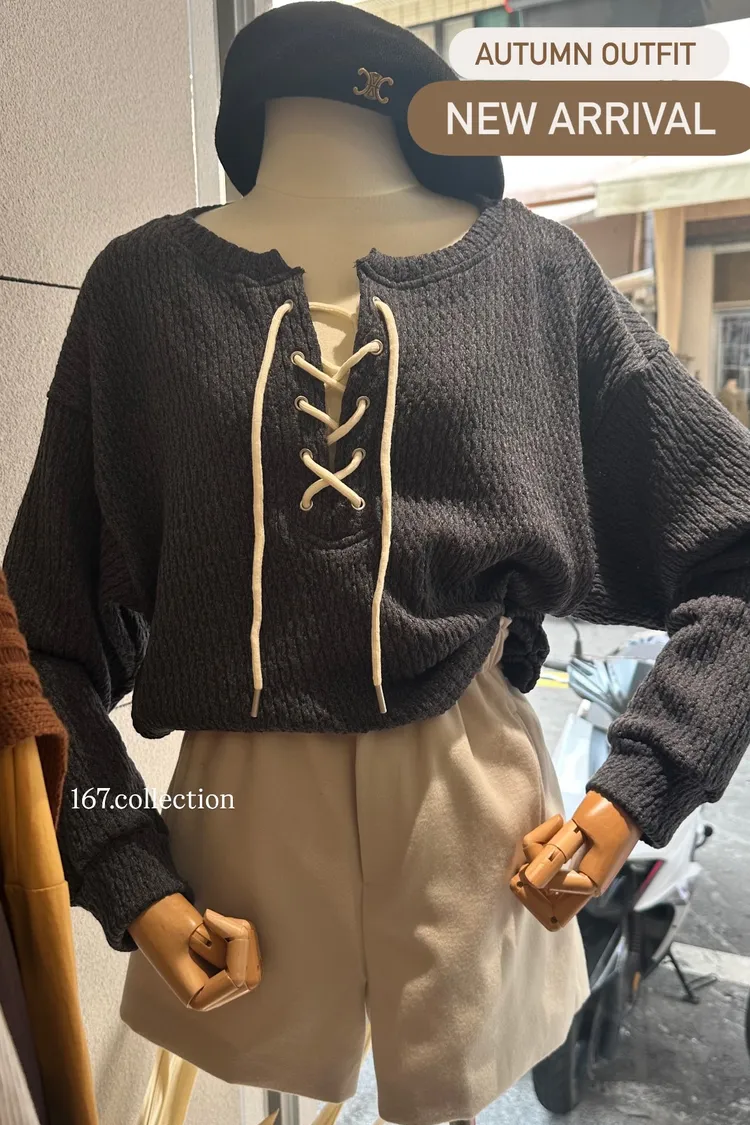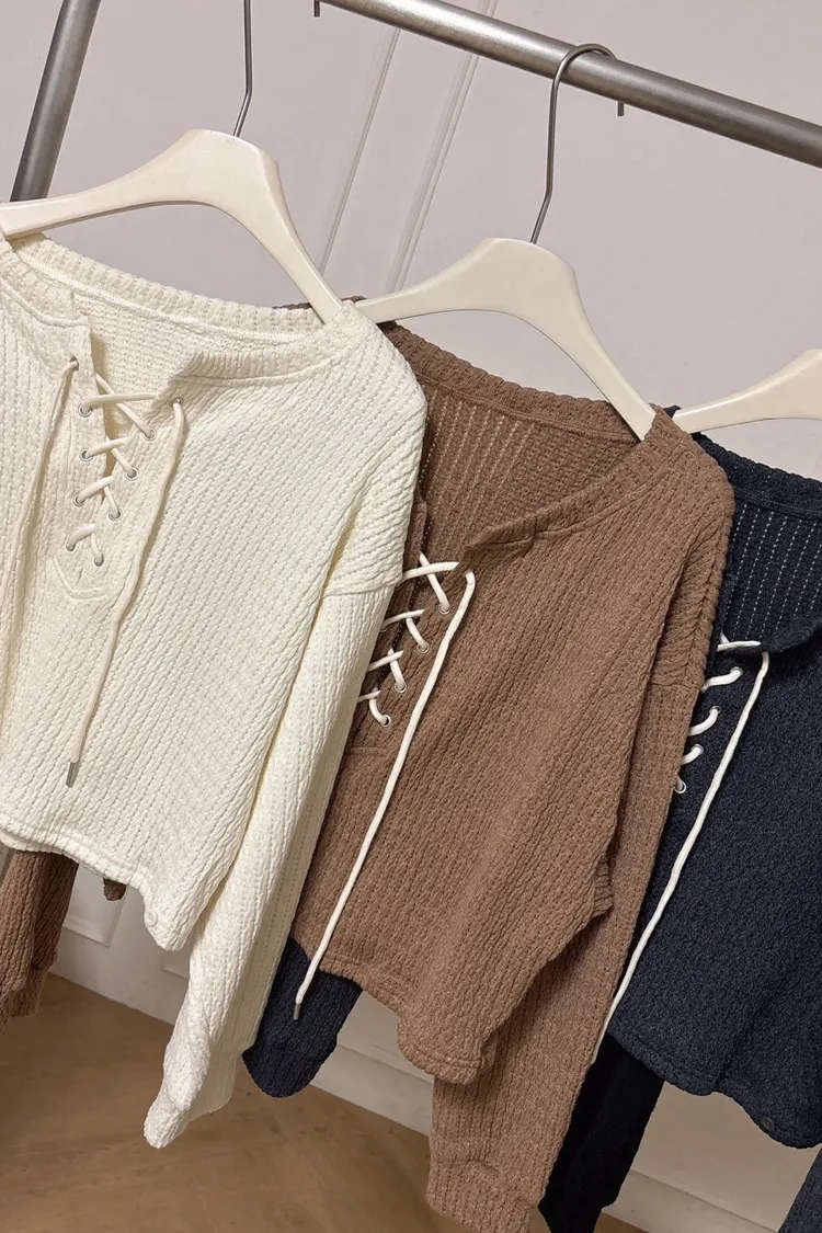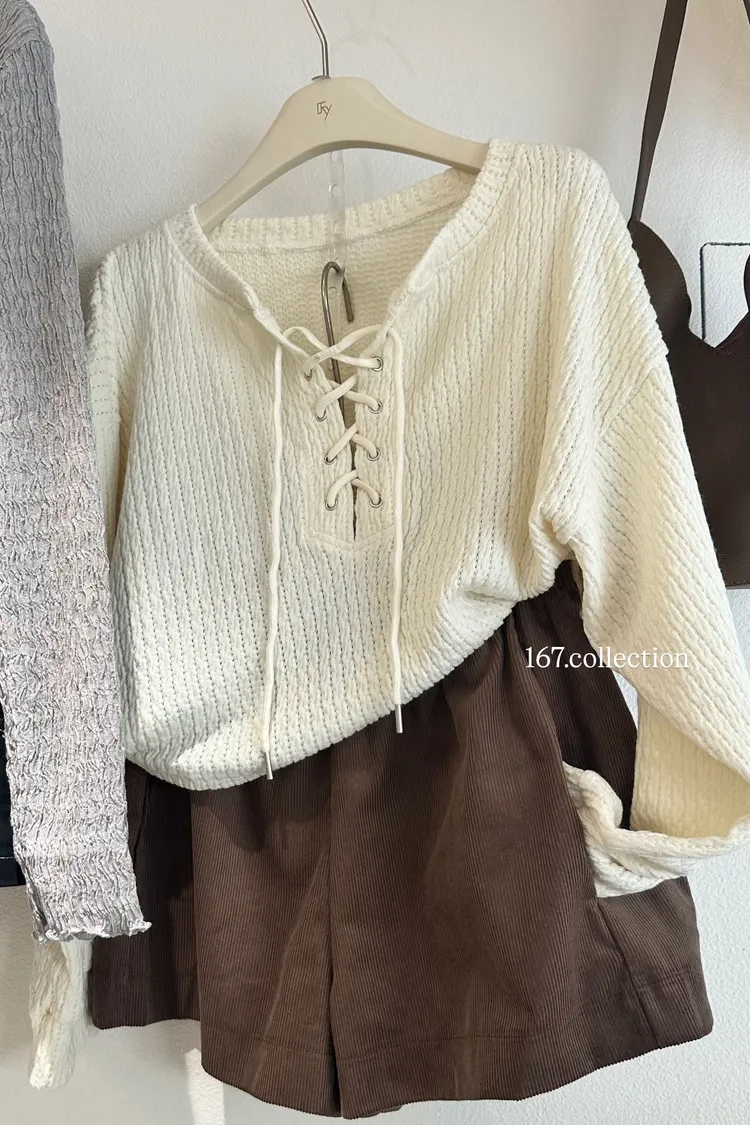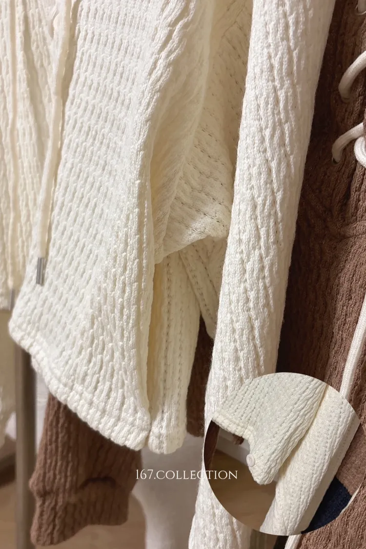 抽繩綁帶長袖織紋上衣