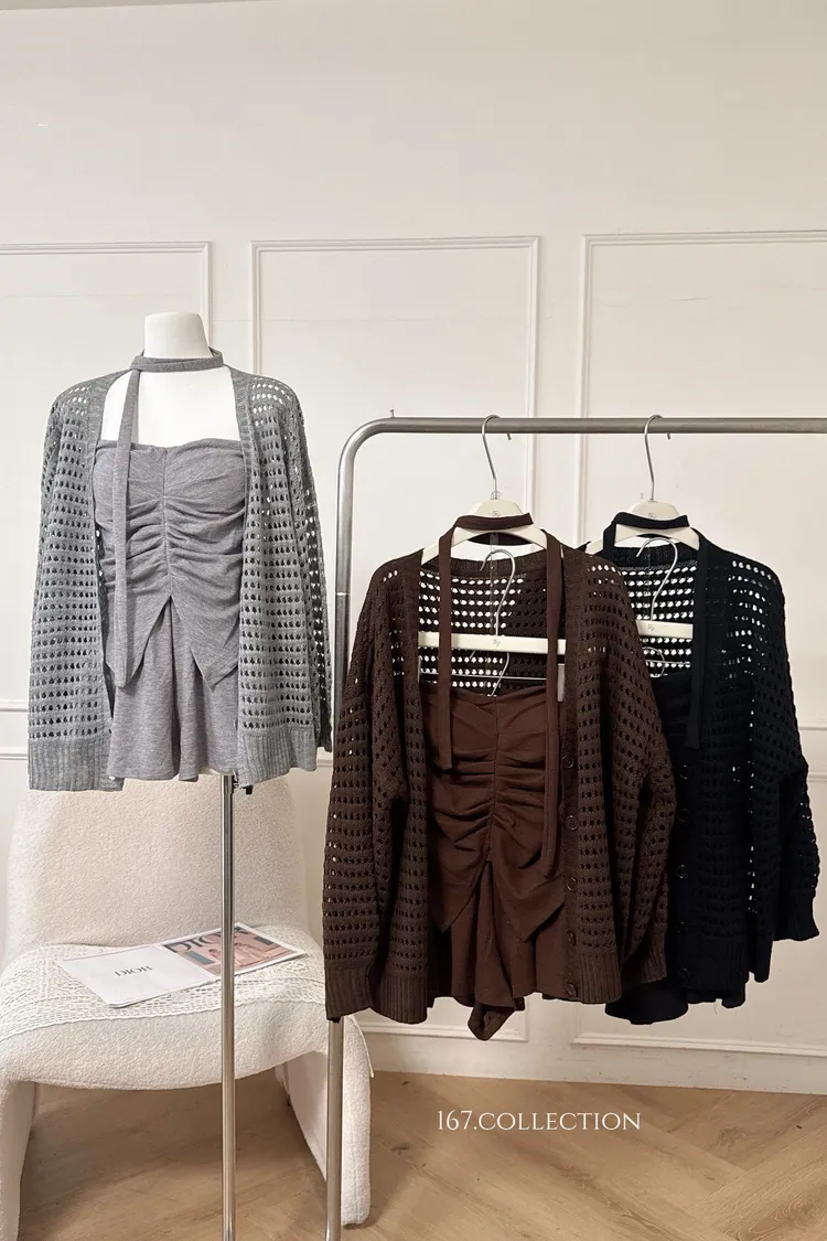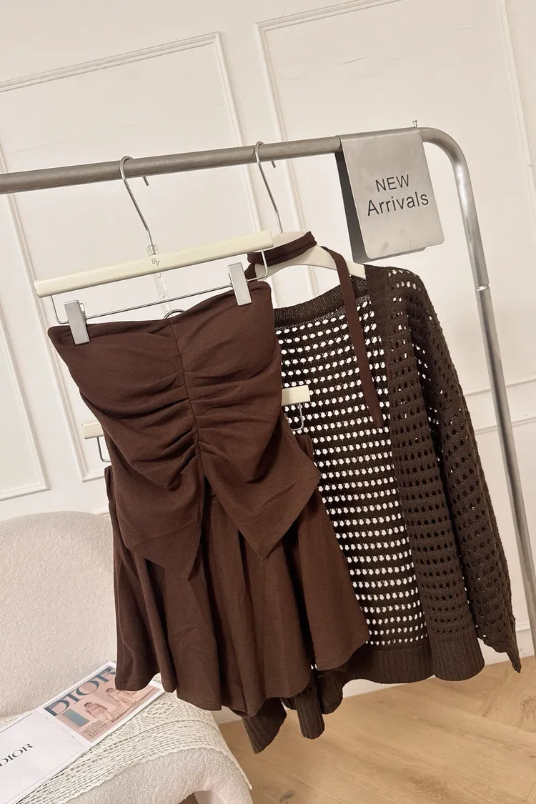 三件式小資組套裝(胸墊上衣+短褲+針織外套)