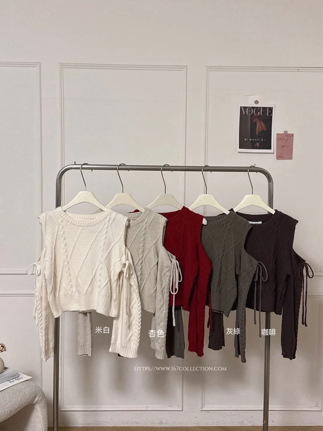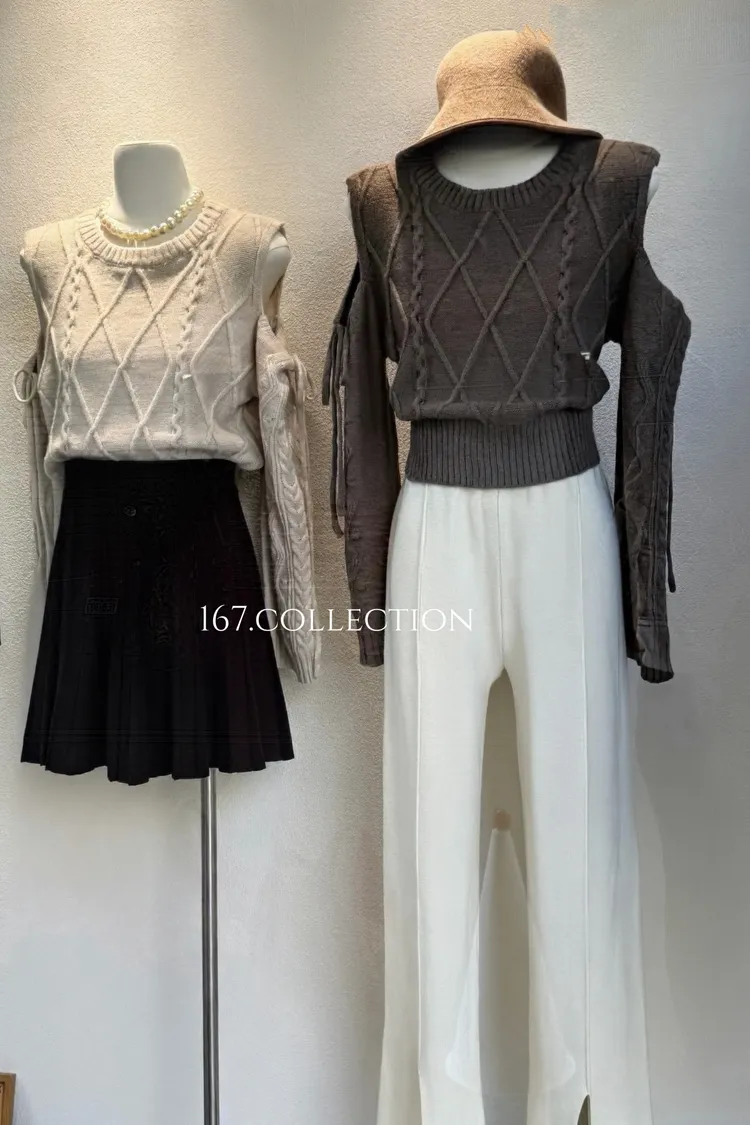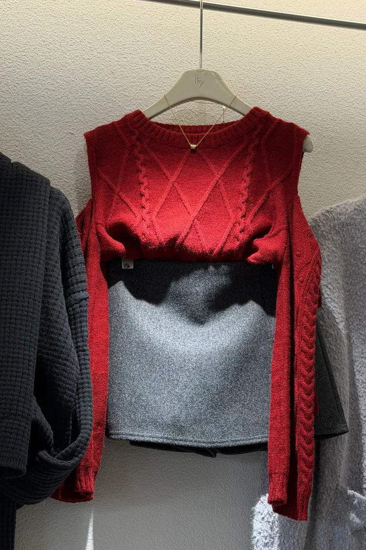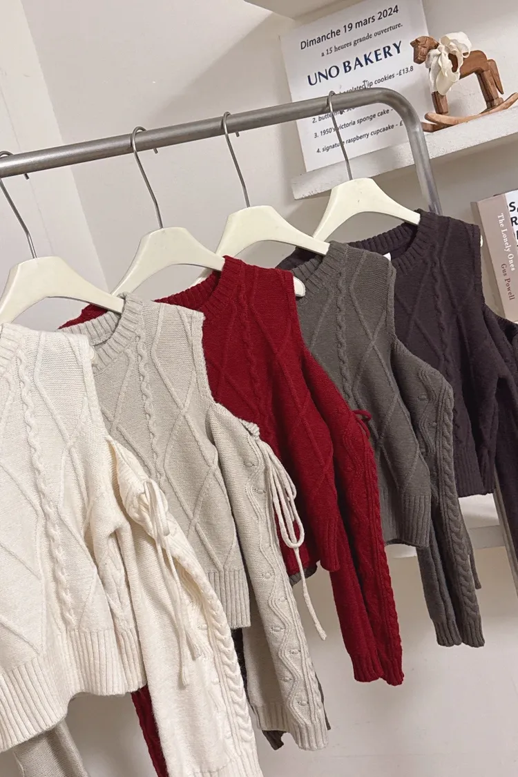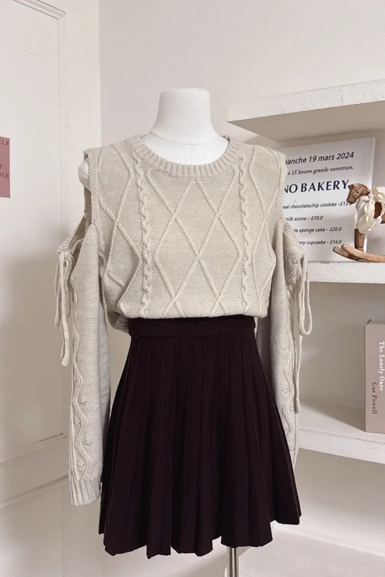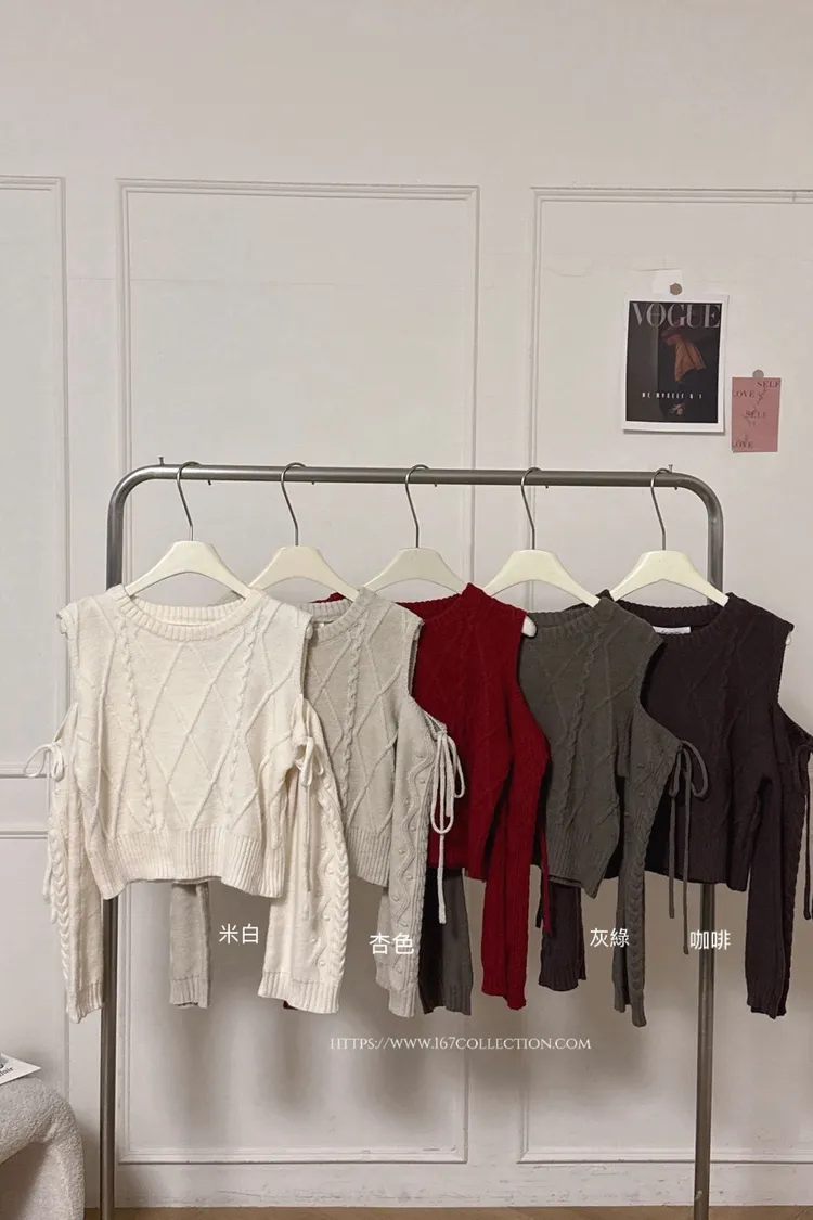 日系露肩綁帶針織麻花上衣