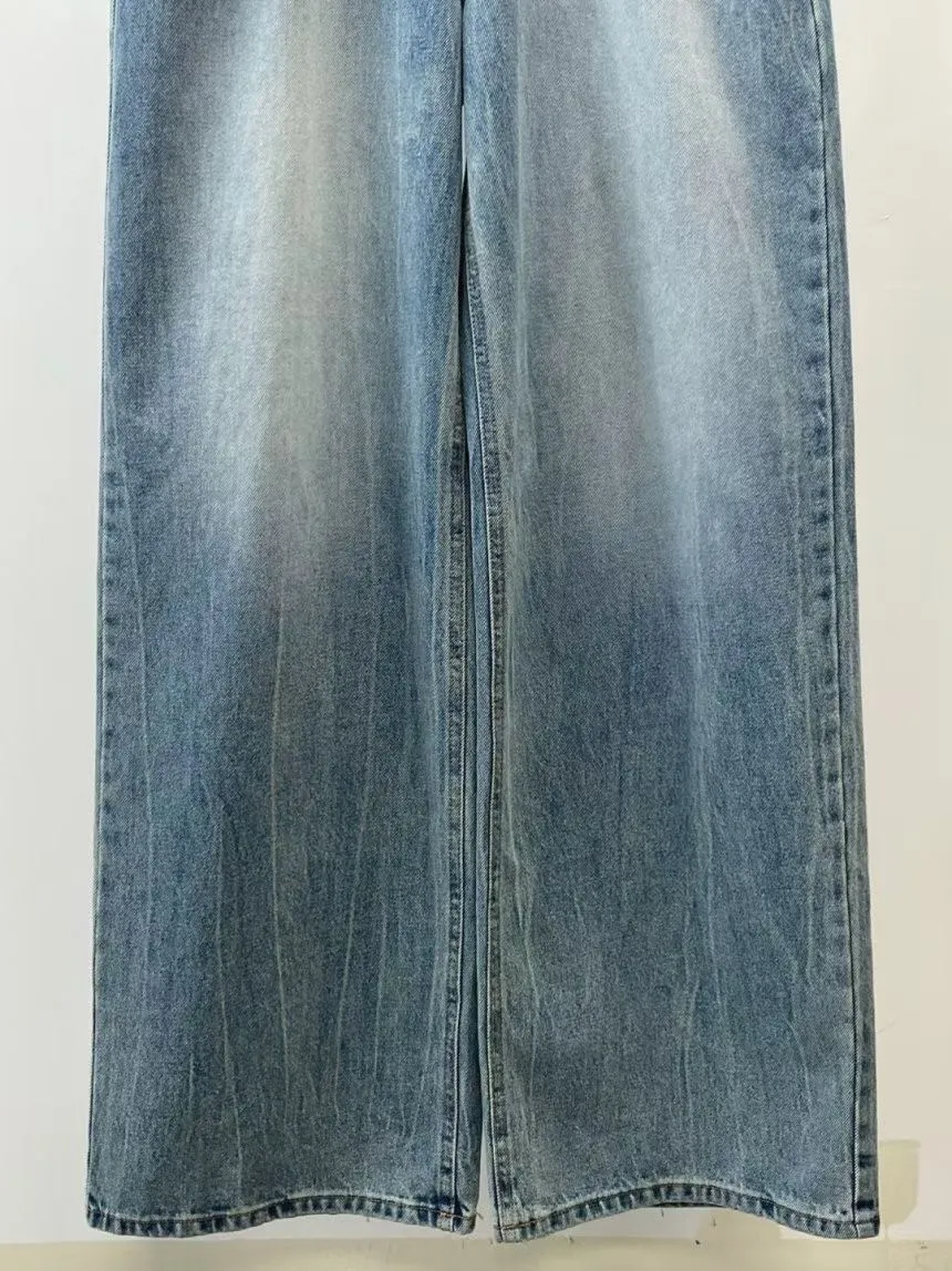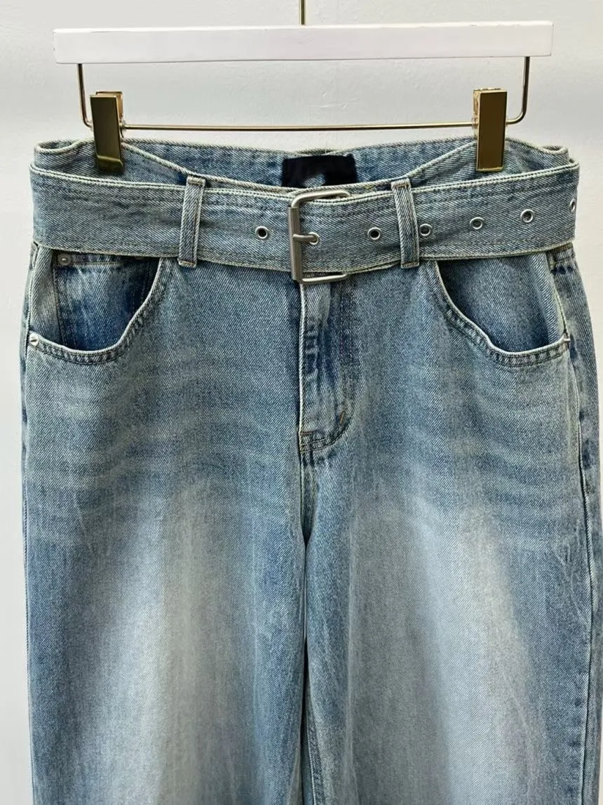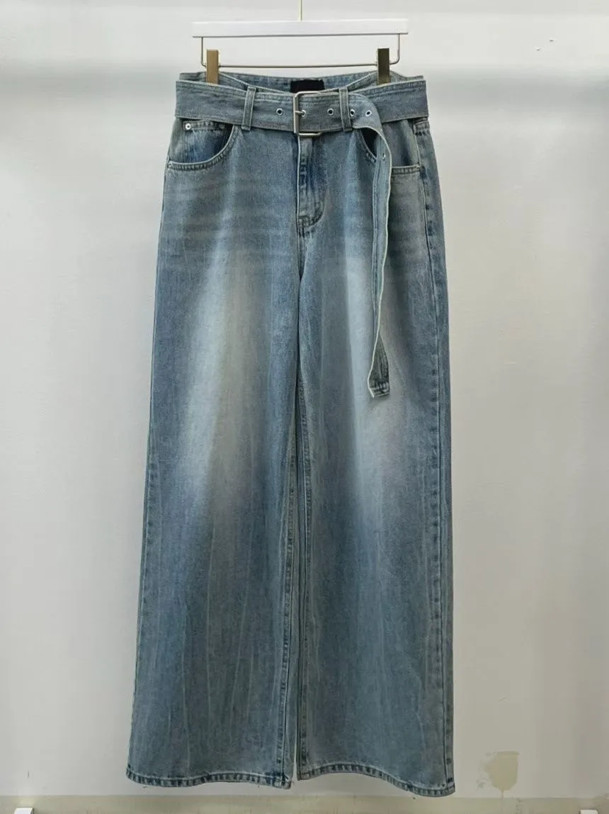 正韓 率性牛仔皮帶闊腿褲