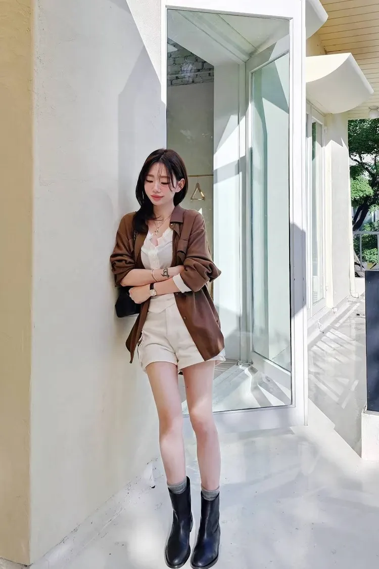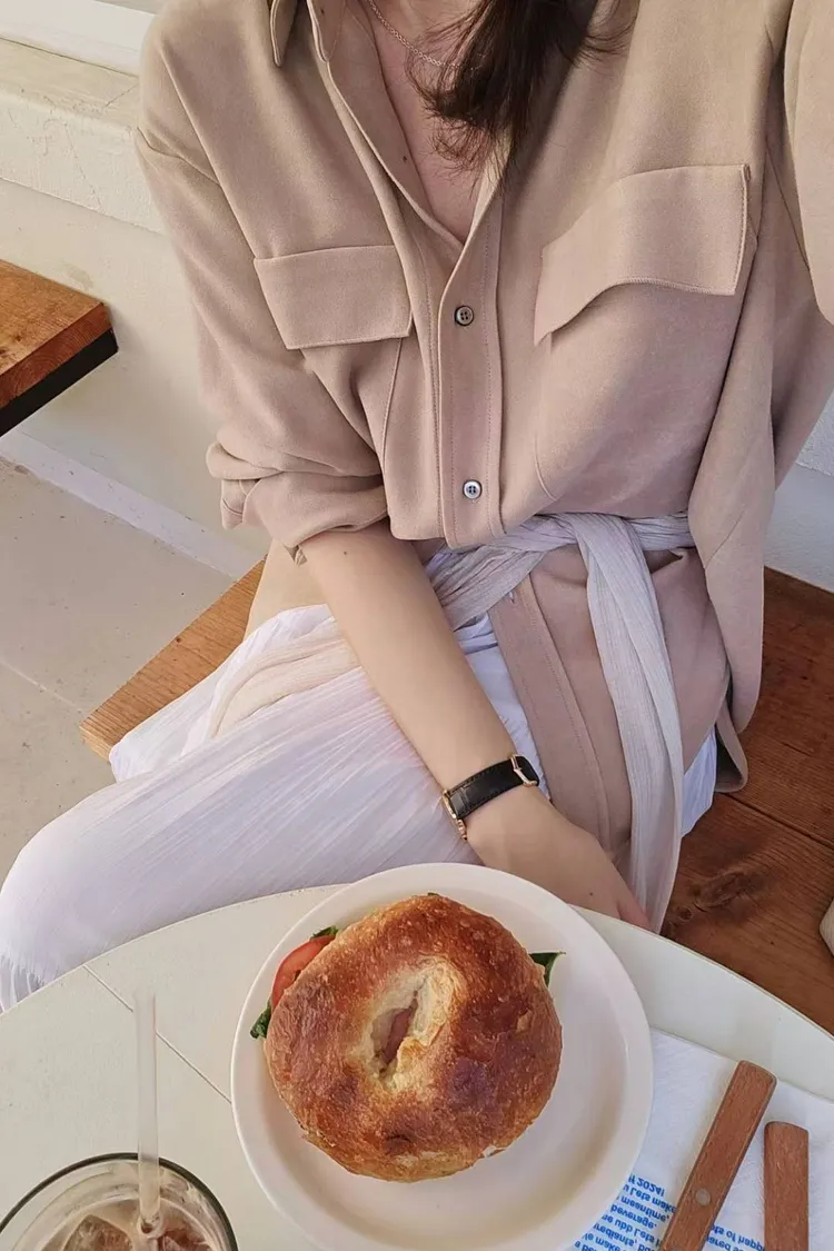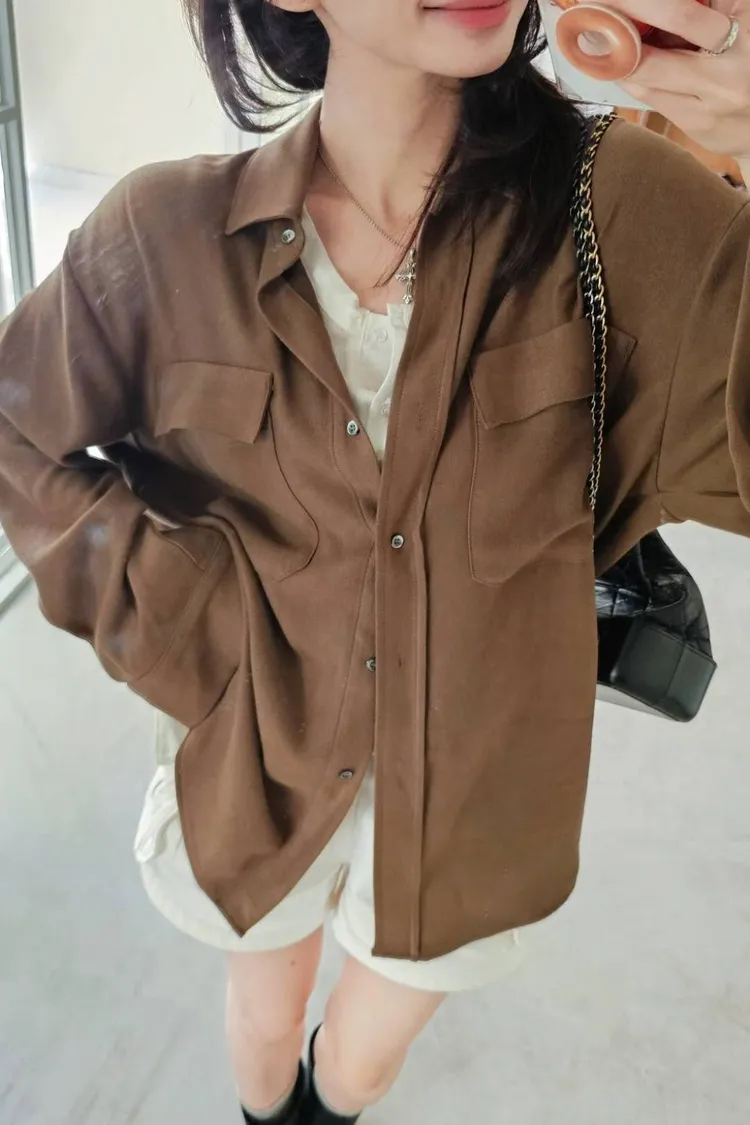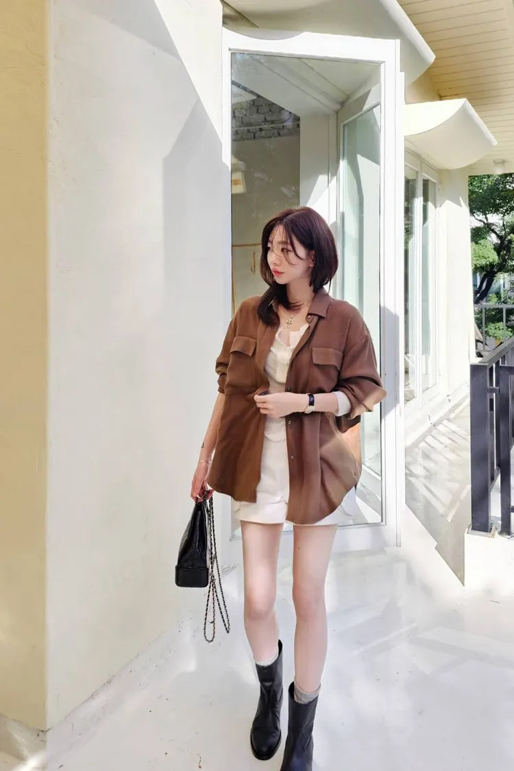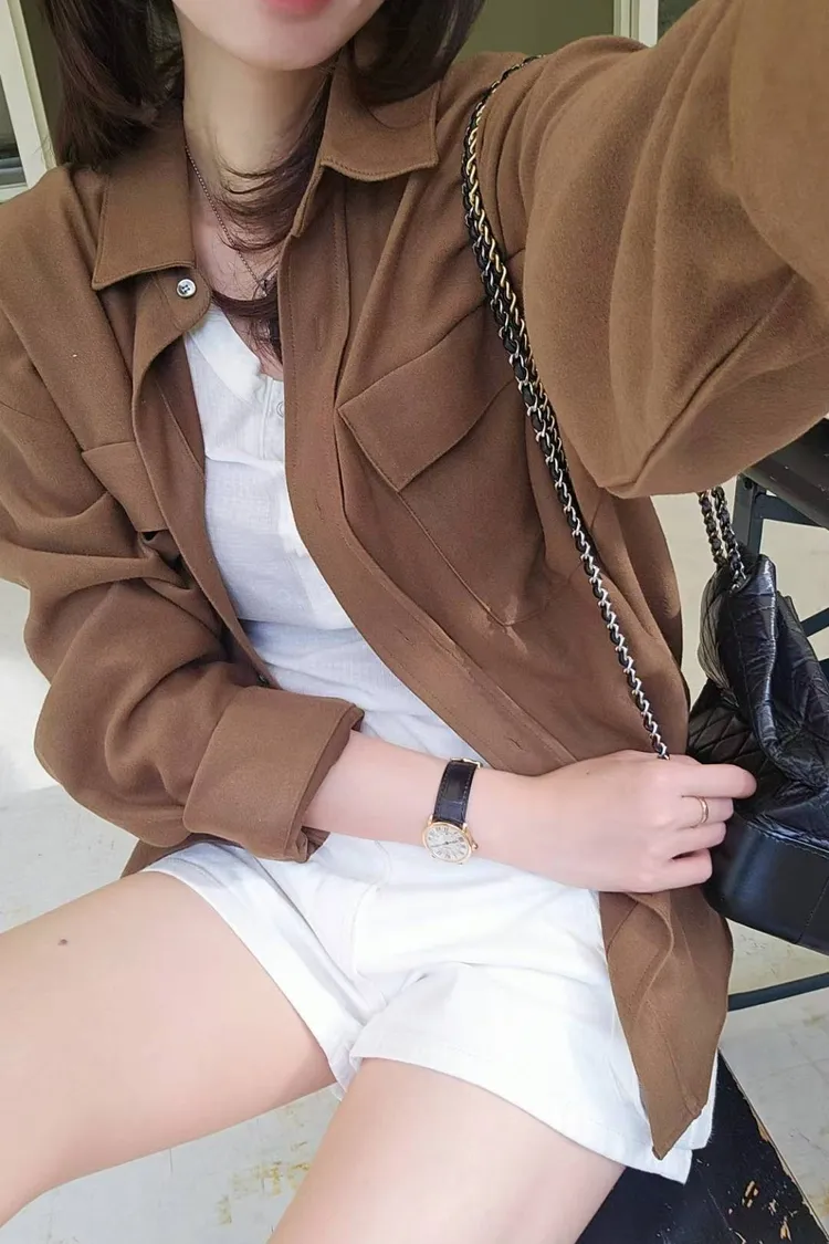 視覺上看起來像是仿麂皮摸起來是柔軟的細緻絨面單穿或是當外罩都合適想嘗試這種風格也可以簡單消化的一款兩個經典大地色系超美 🍂🤎😎 中等厚度布料 觸感柔軟舒適親膚帶有微微絨感面~內層是光滑面 不帶絨毛 70%嫘瑩+30%聚酯 Onni搭配🩰口袋奶油短褲