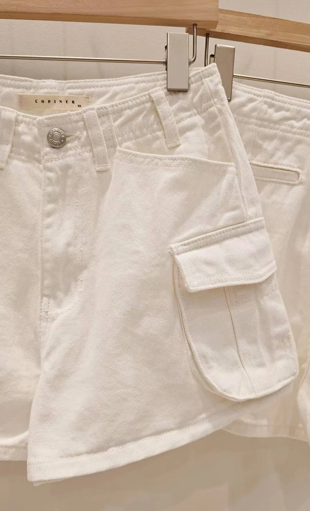 面料是基礎四季款一般厚度,水洗加工後柔軟又帶挺度,👌👍 顏色是漂亮的牛奶白,丹寧布料質感非常好,((奶油褲系列的布料都是日本進口的喔 ! !))