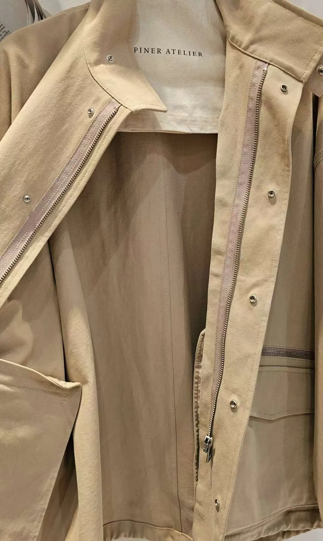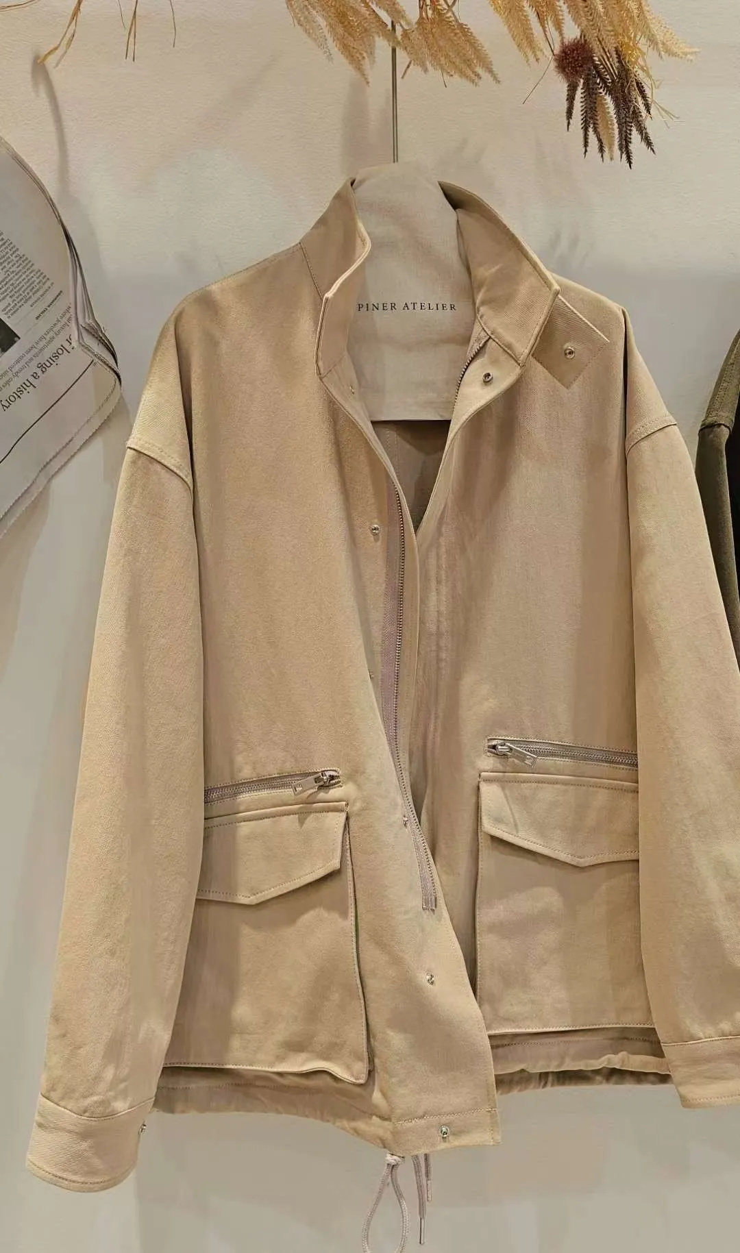 下擺有抽繩,小立領,蓋袋口袋+拉鍊口袋