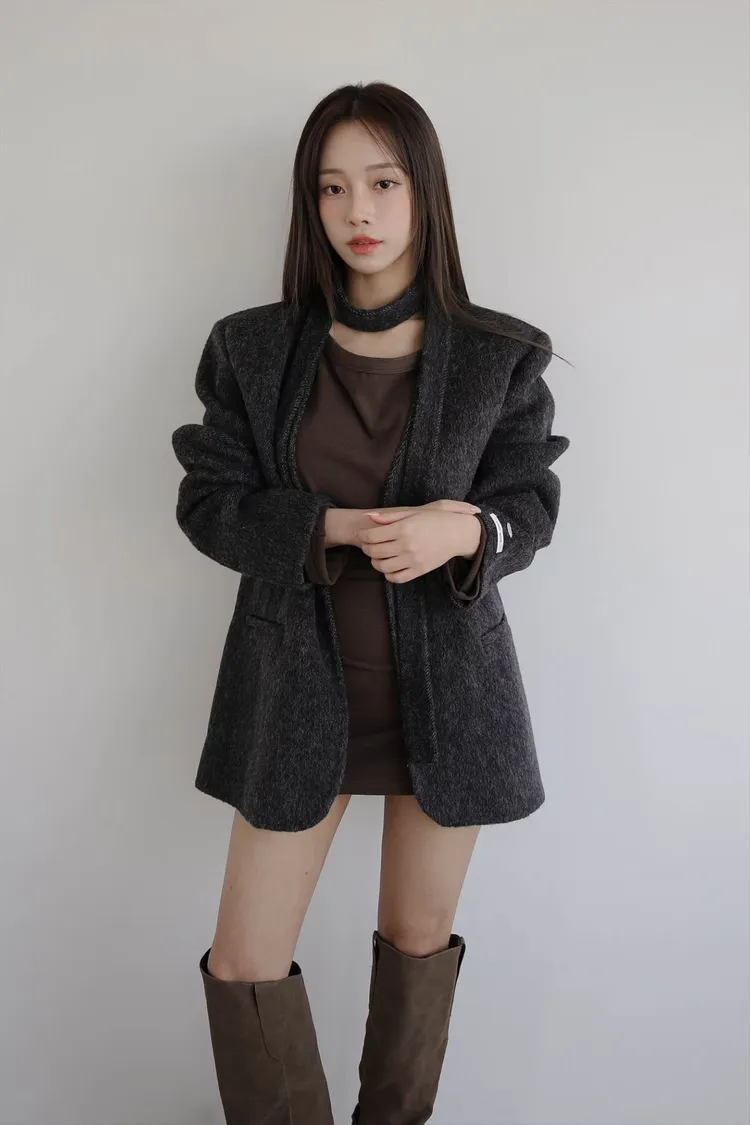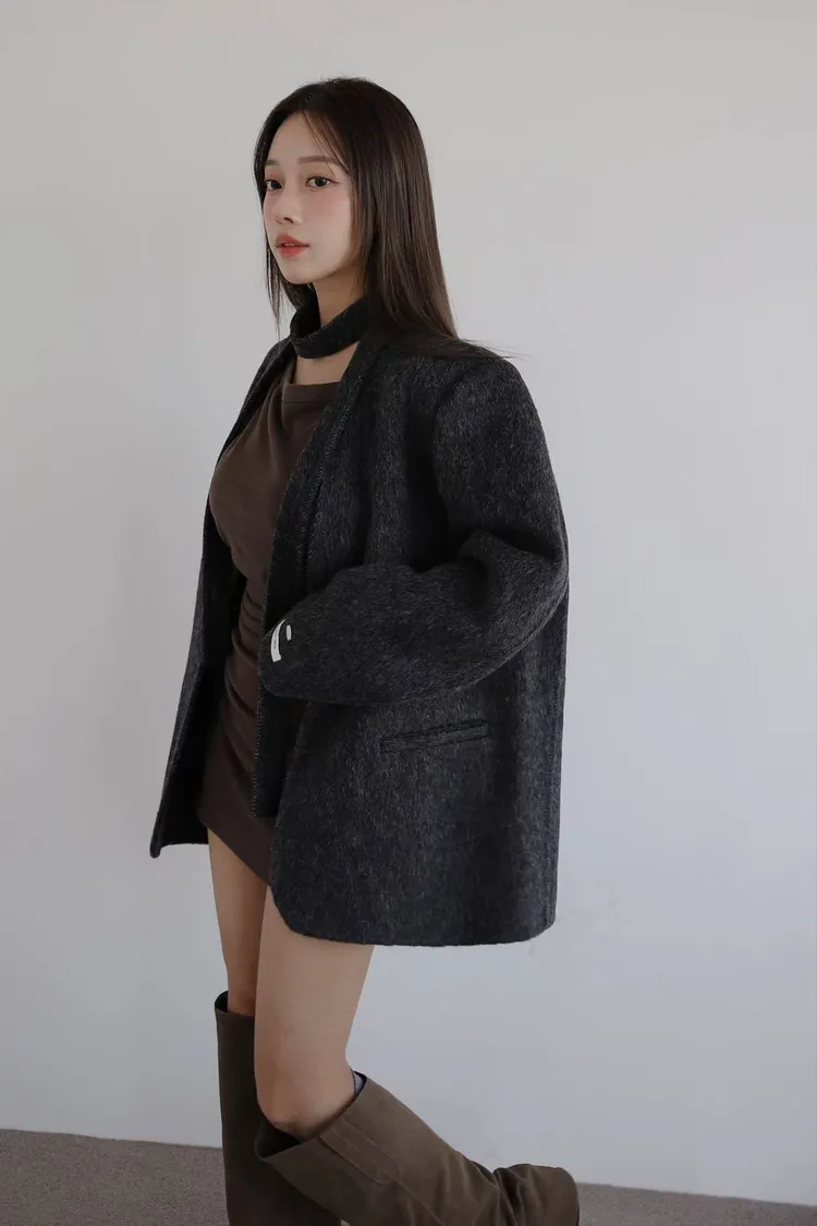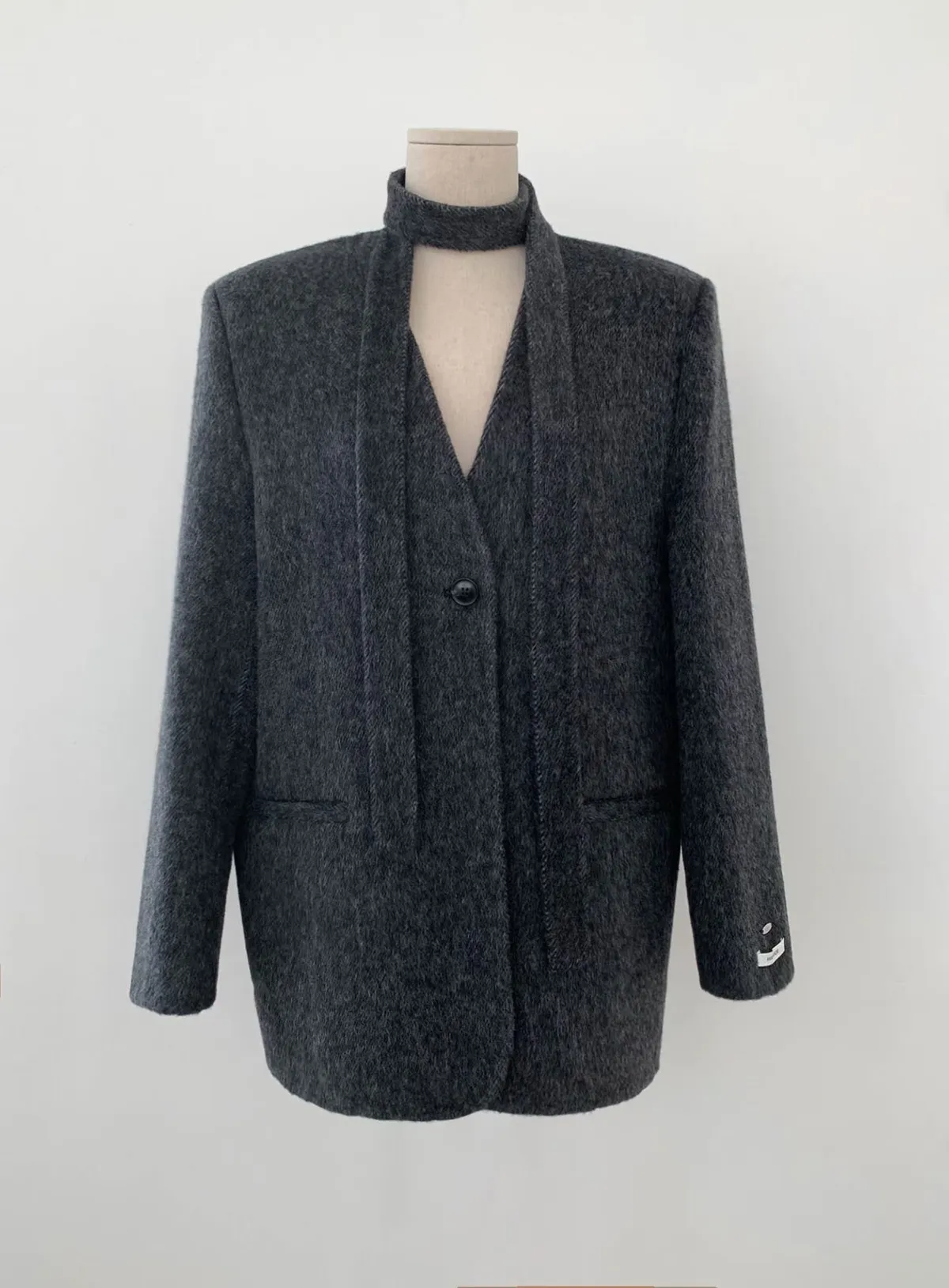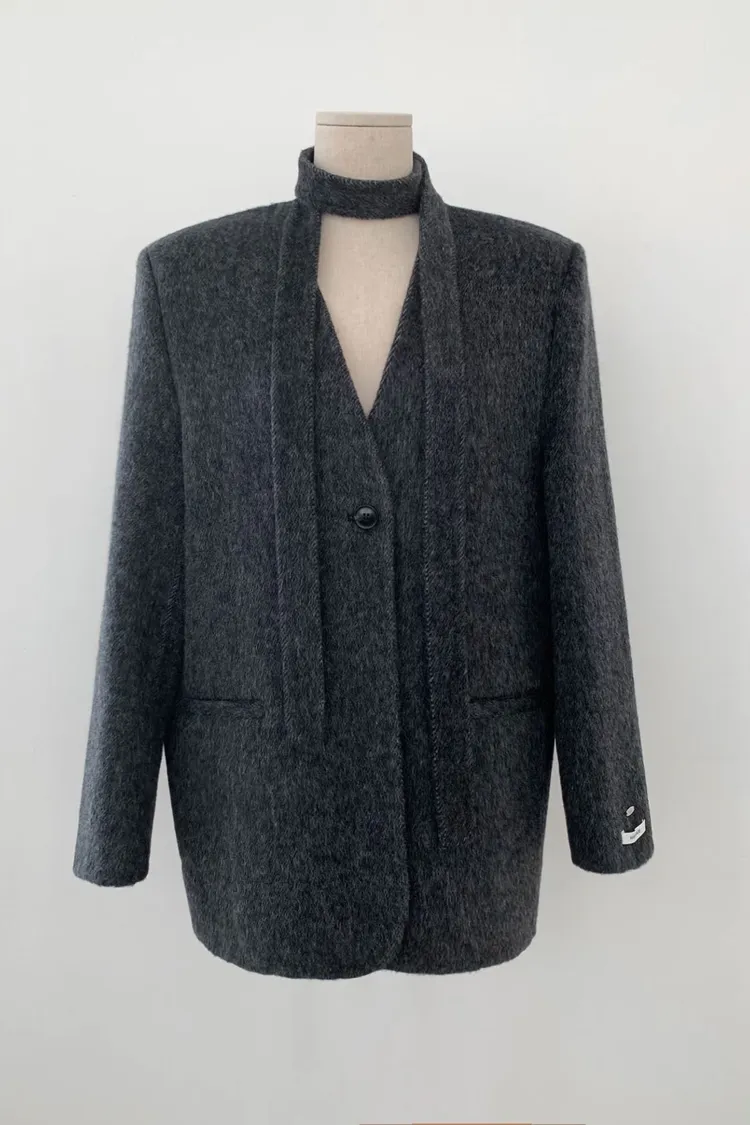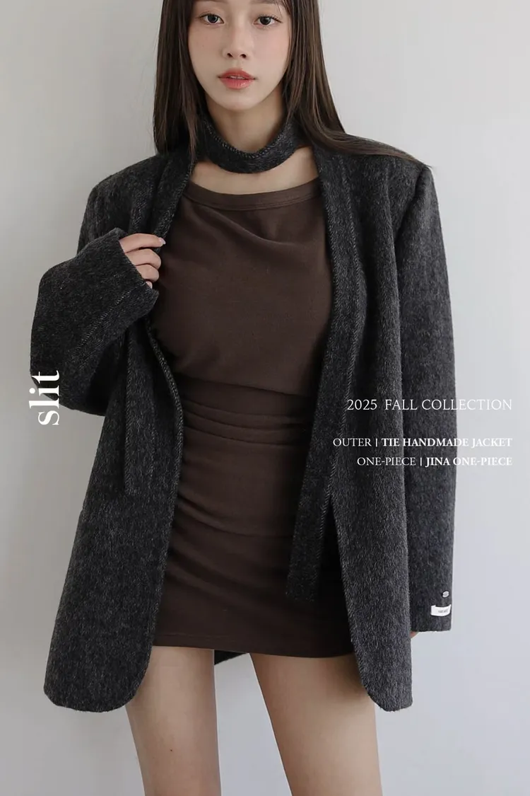 TIE HANDMADE JACKET Shoulder: 44cm Bust: 55cm Sleeve length: 60cm Body length : 71cm 80% Wool, 15% Polyester, 4% Rayon, 1% Nylon Made in Korea