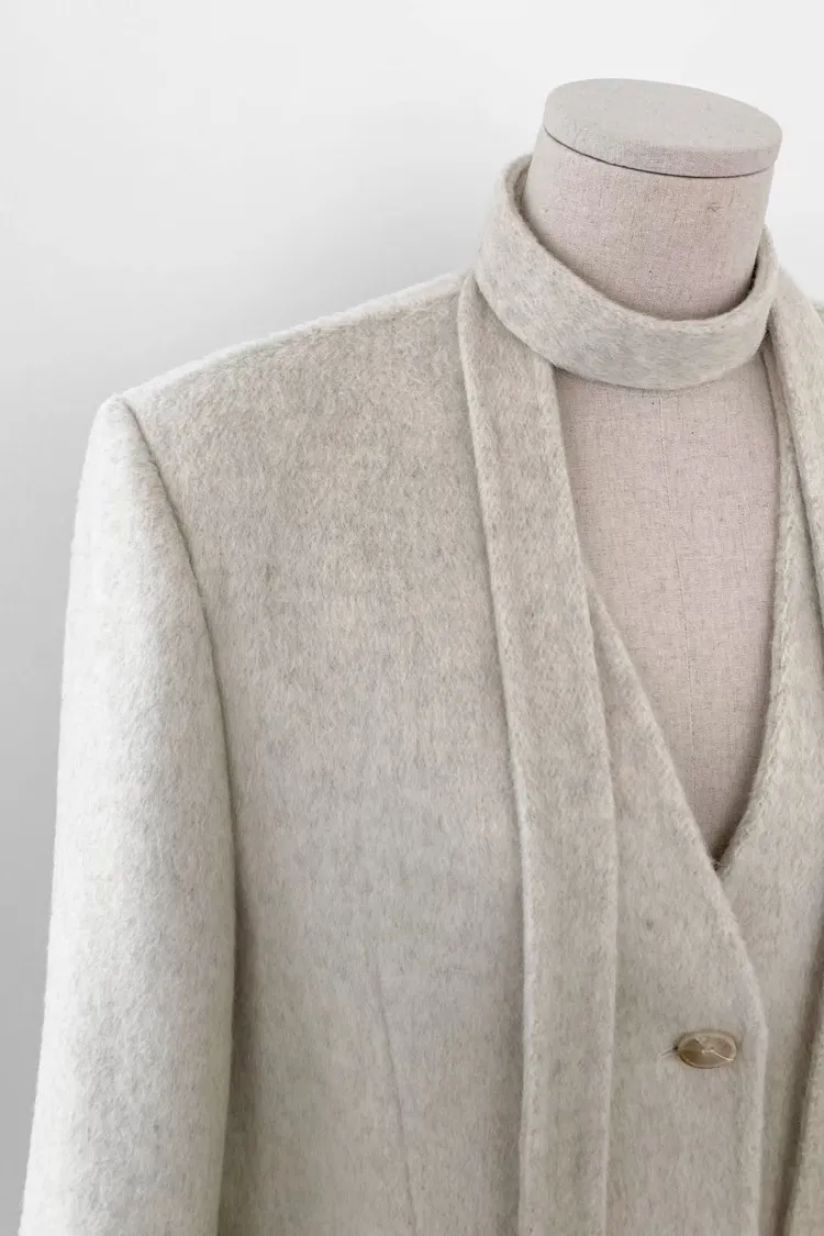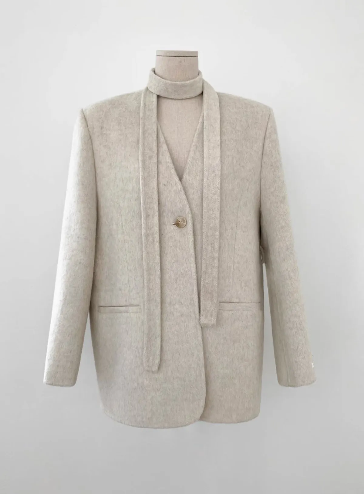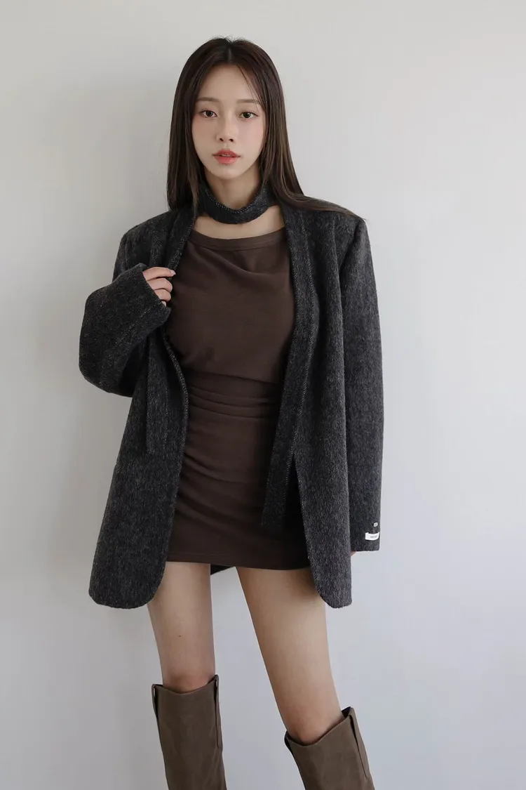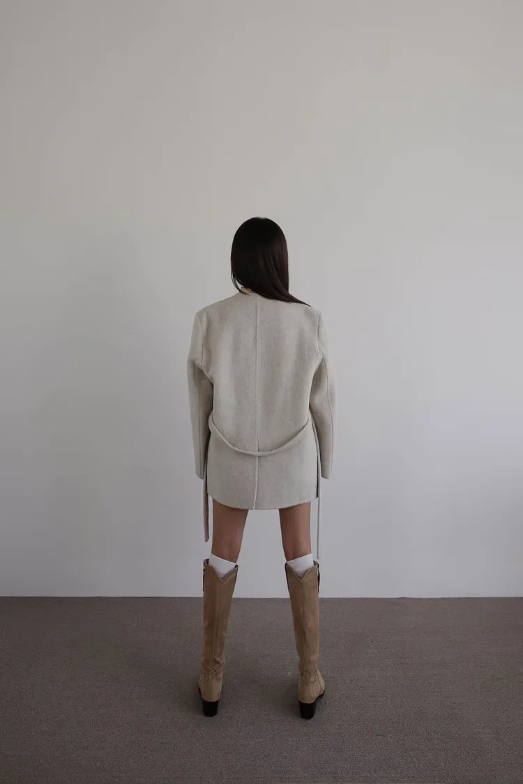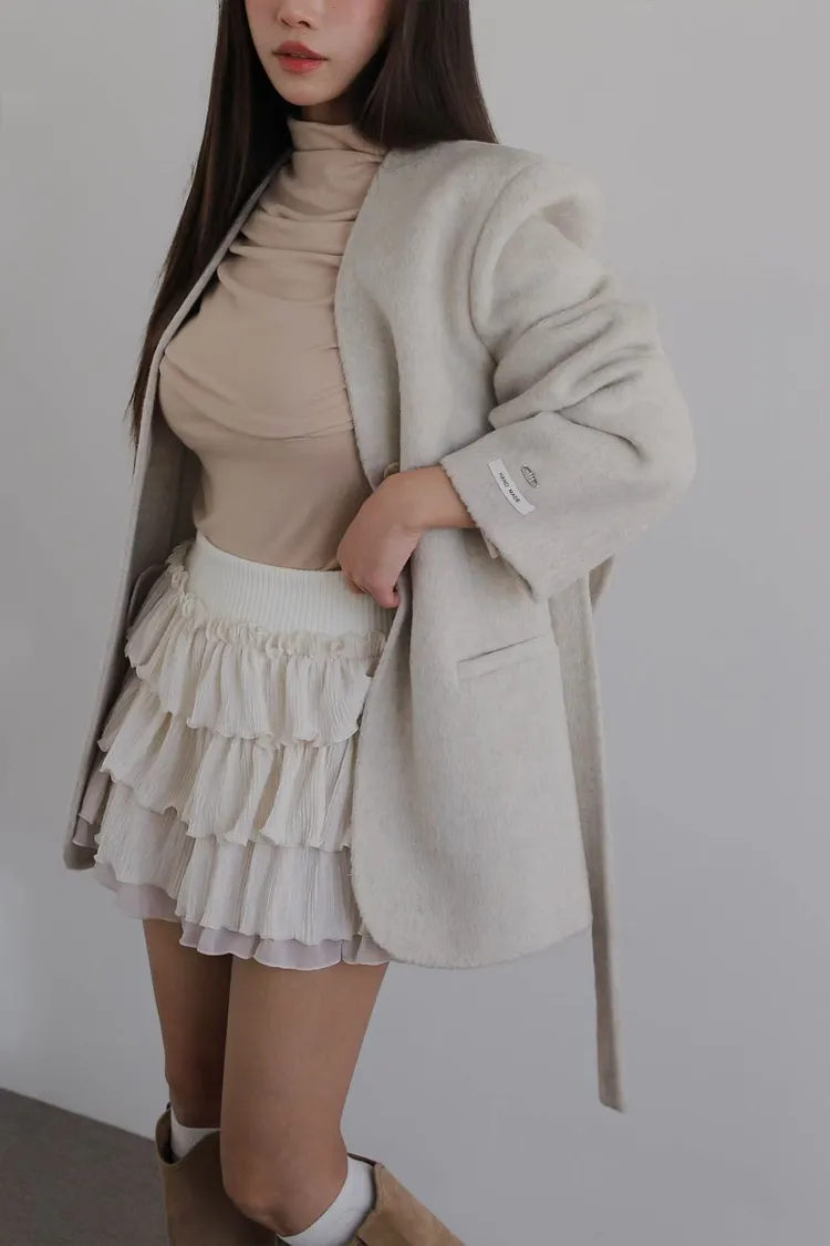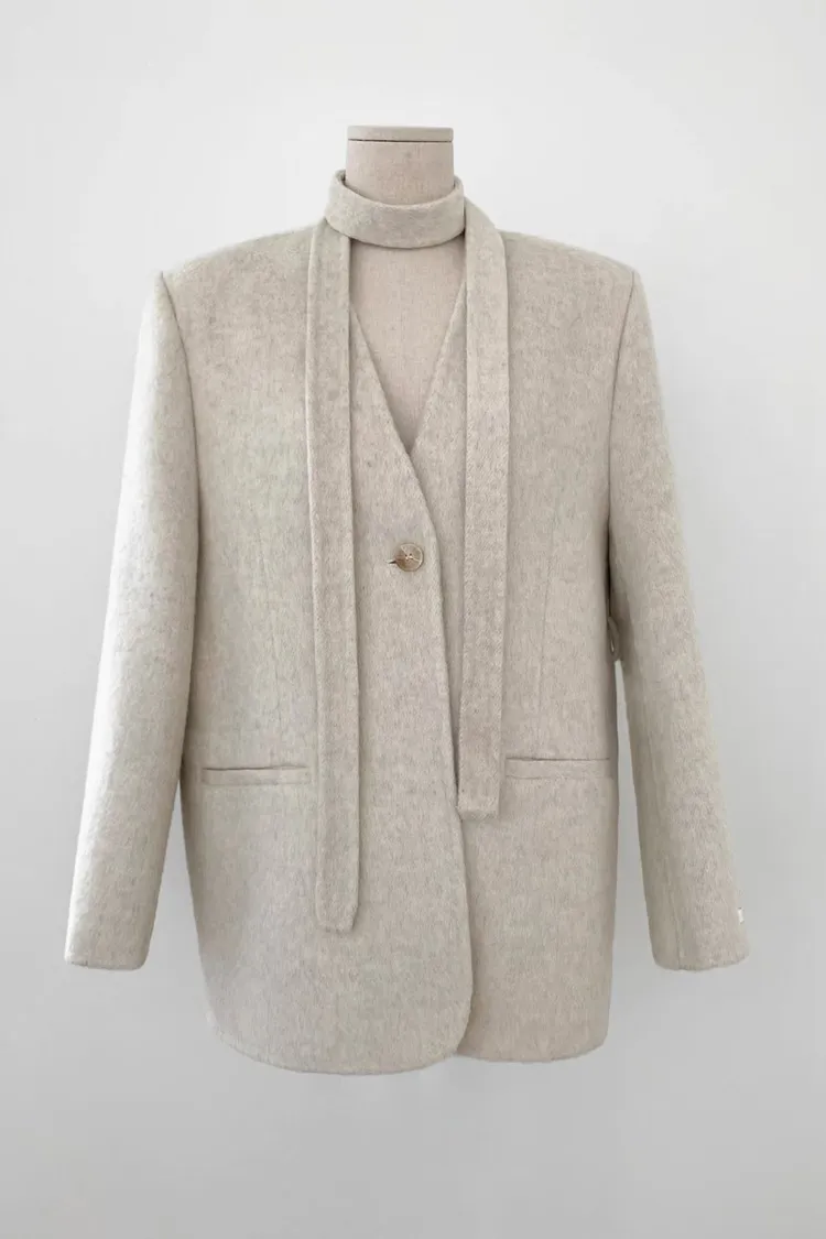 TIE HANDMADE JACKET Shoulder: 44cm Bust: 55cm Sleeve length: 60cm Body length : 71cm 80% Wool, 15% Polyester, 4% Rayon, 1% Nylon Made in Korea