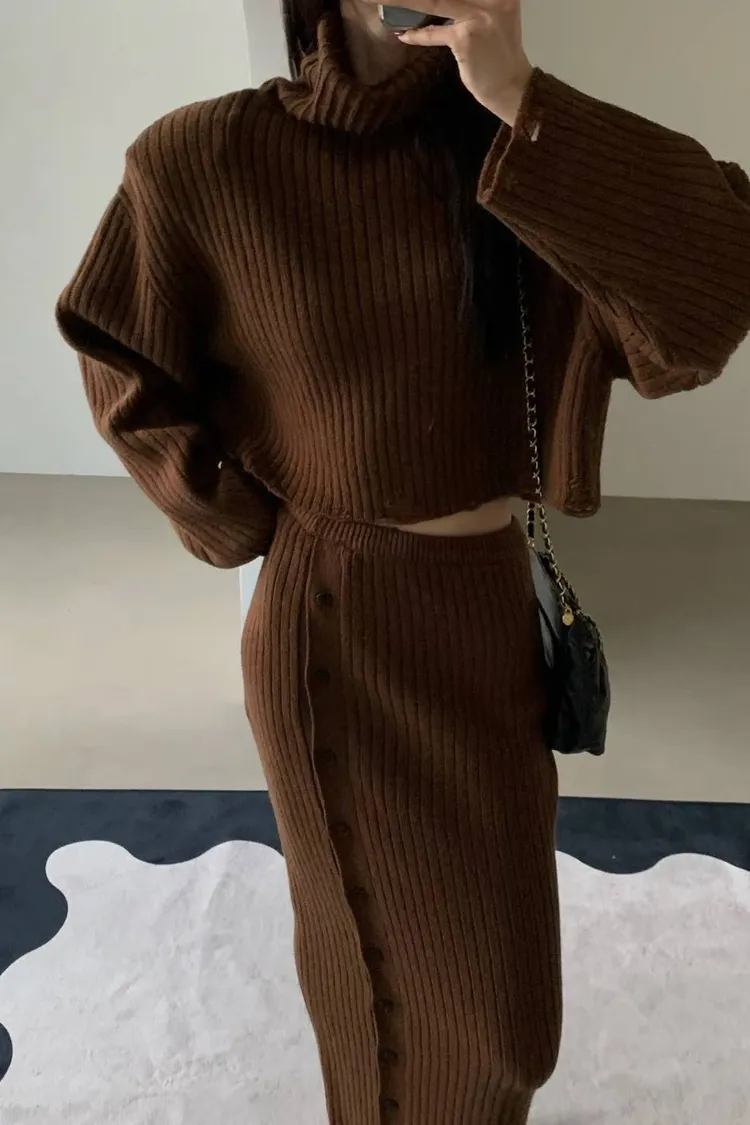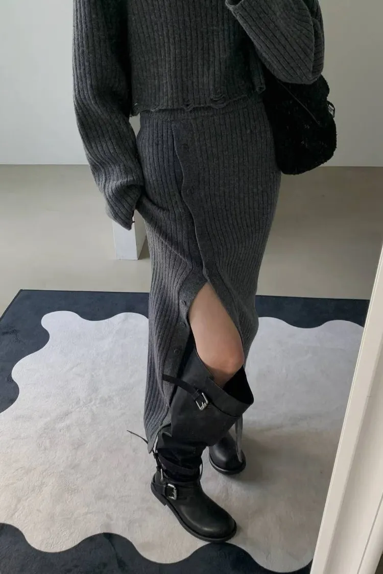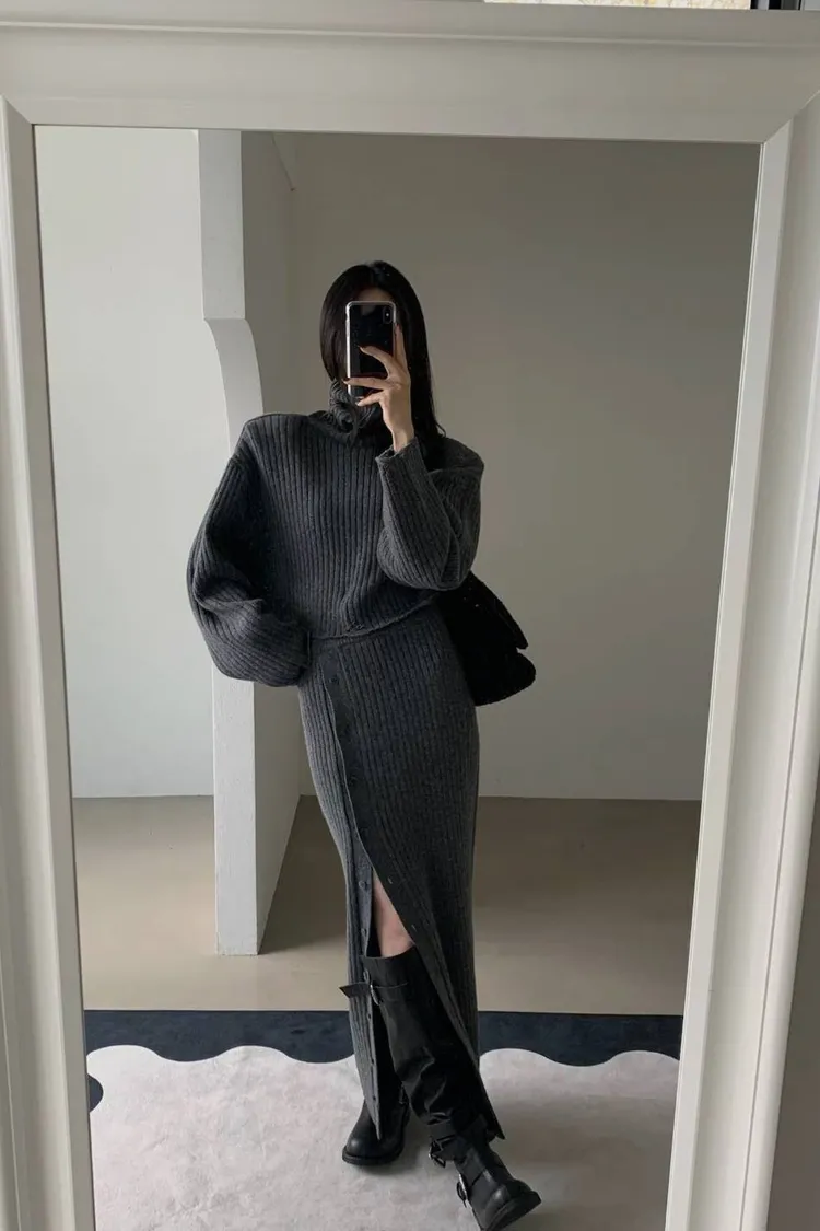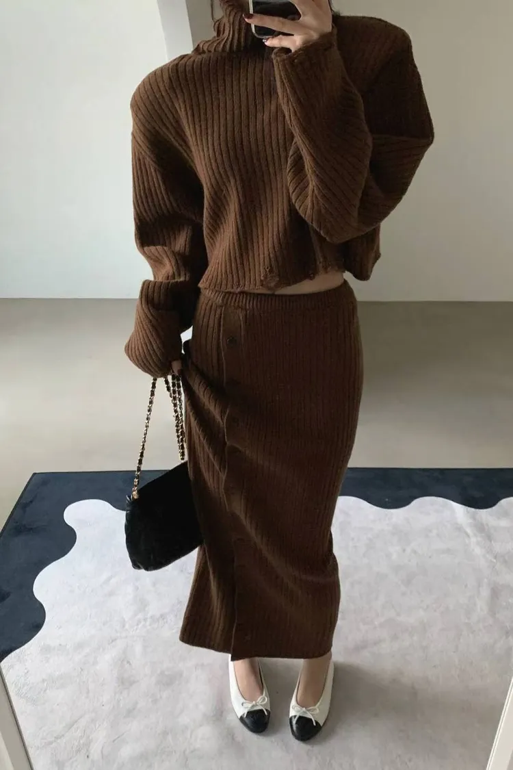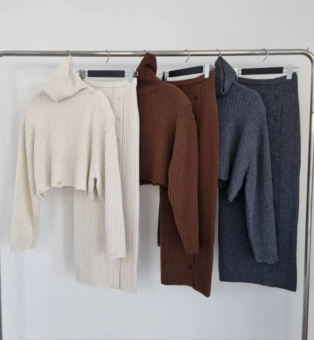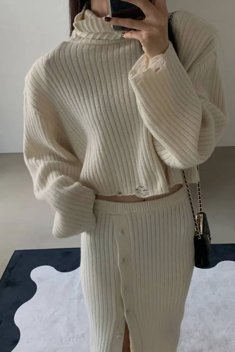 正韓 針織高領破損上衣+開衩性感長裙