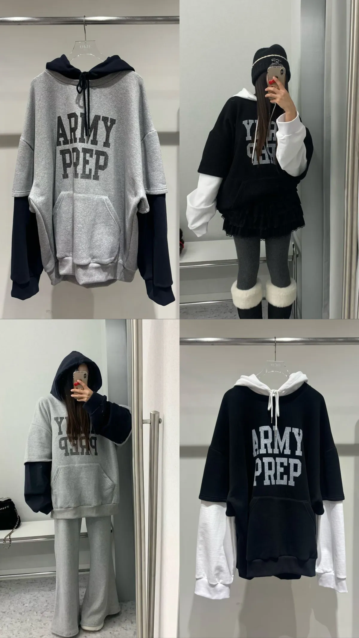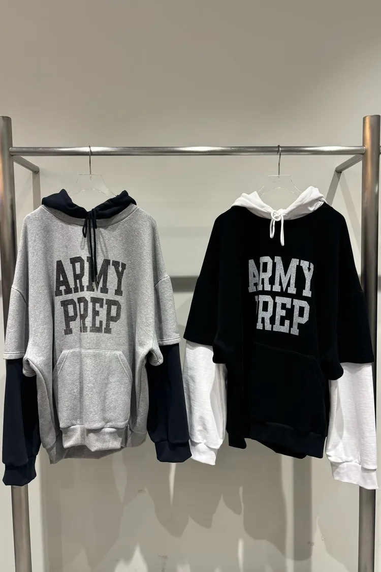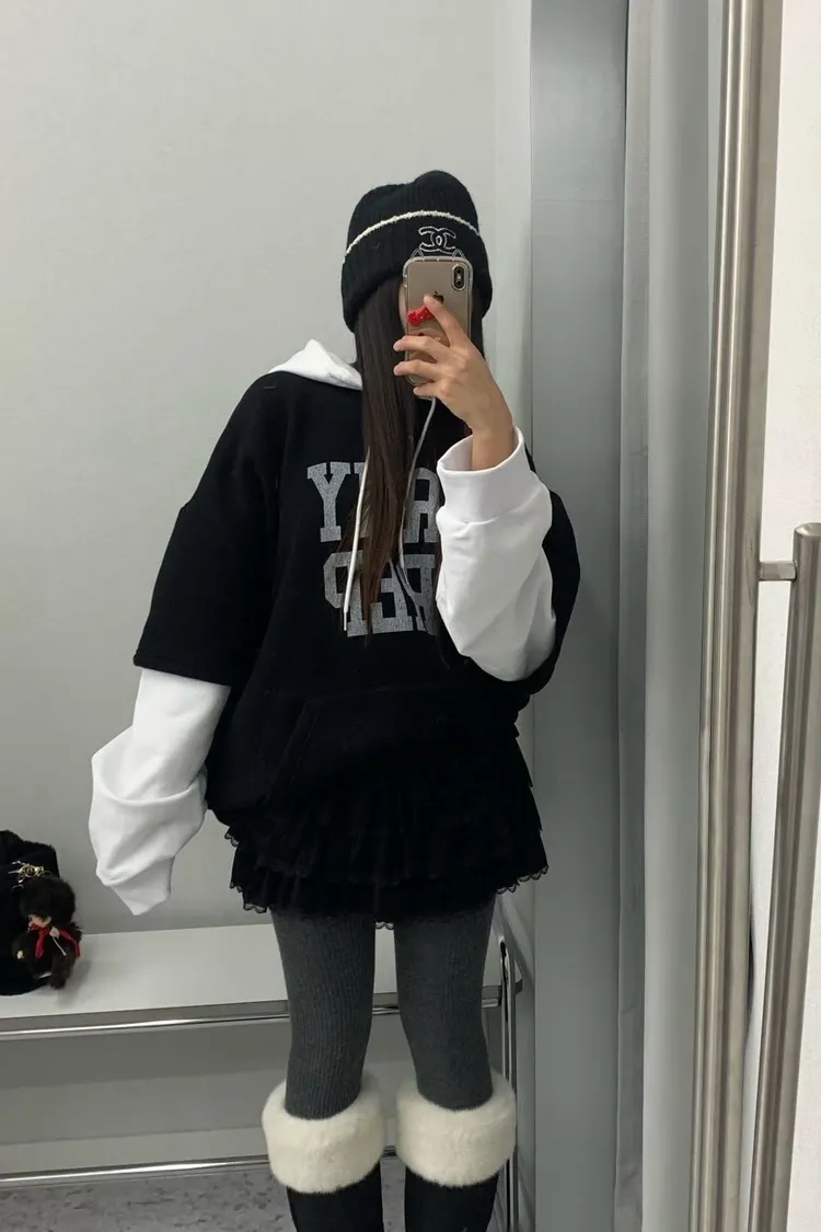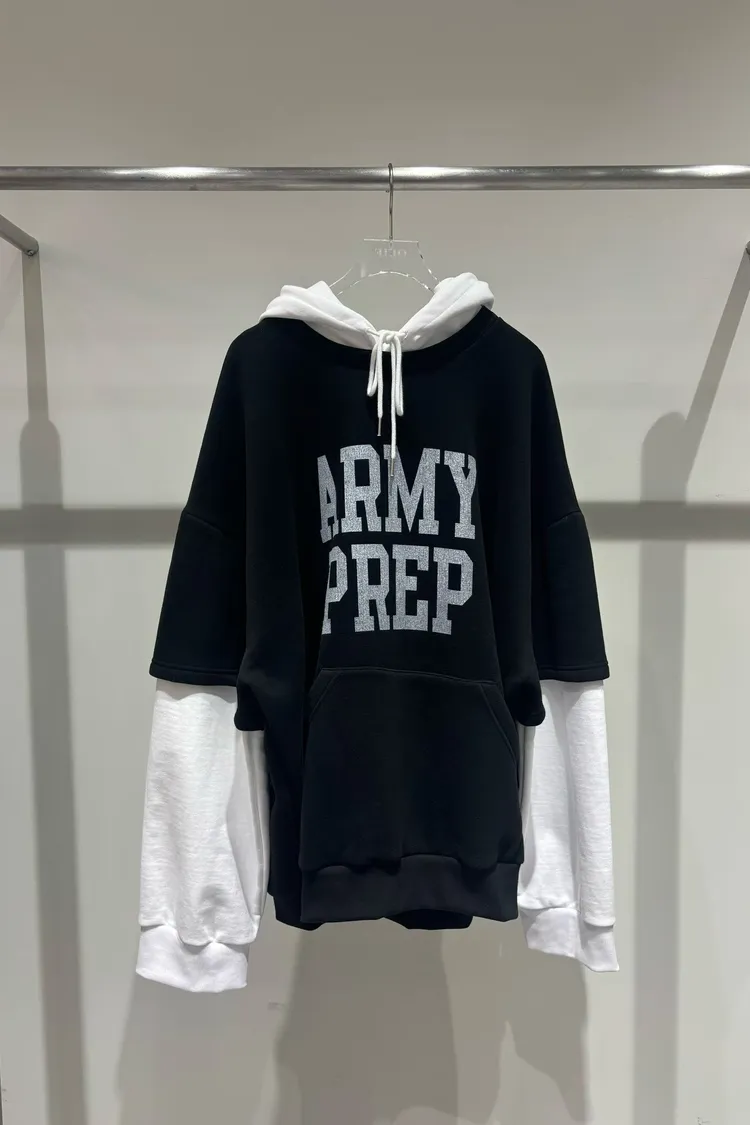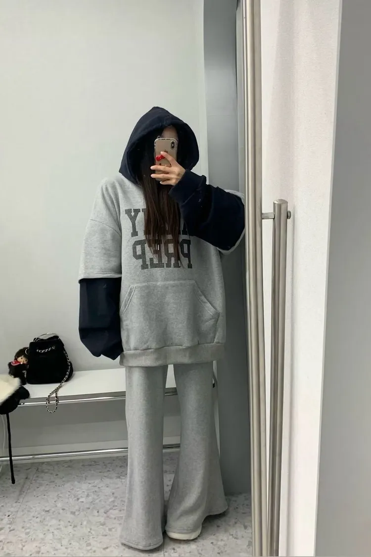 正韓 假兩件休閒寬版連帽上衣