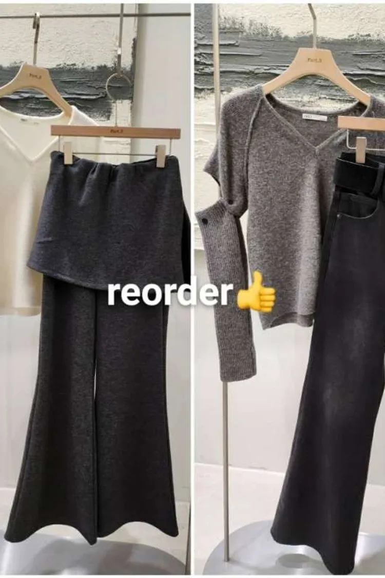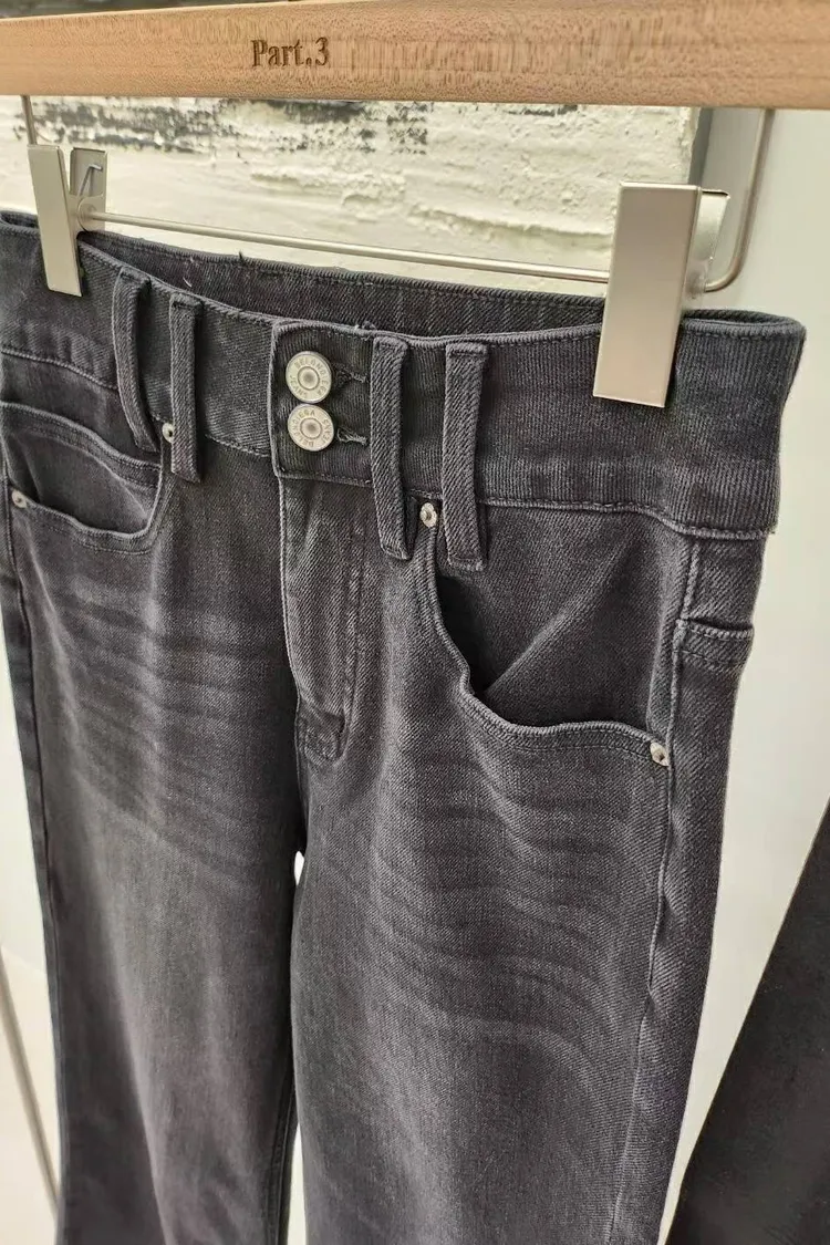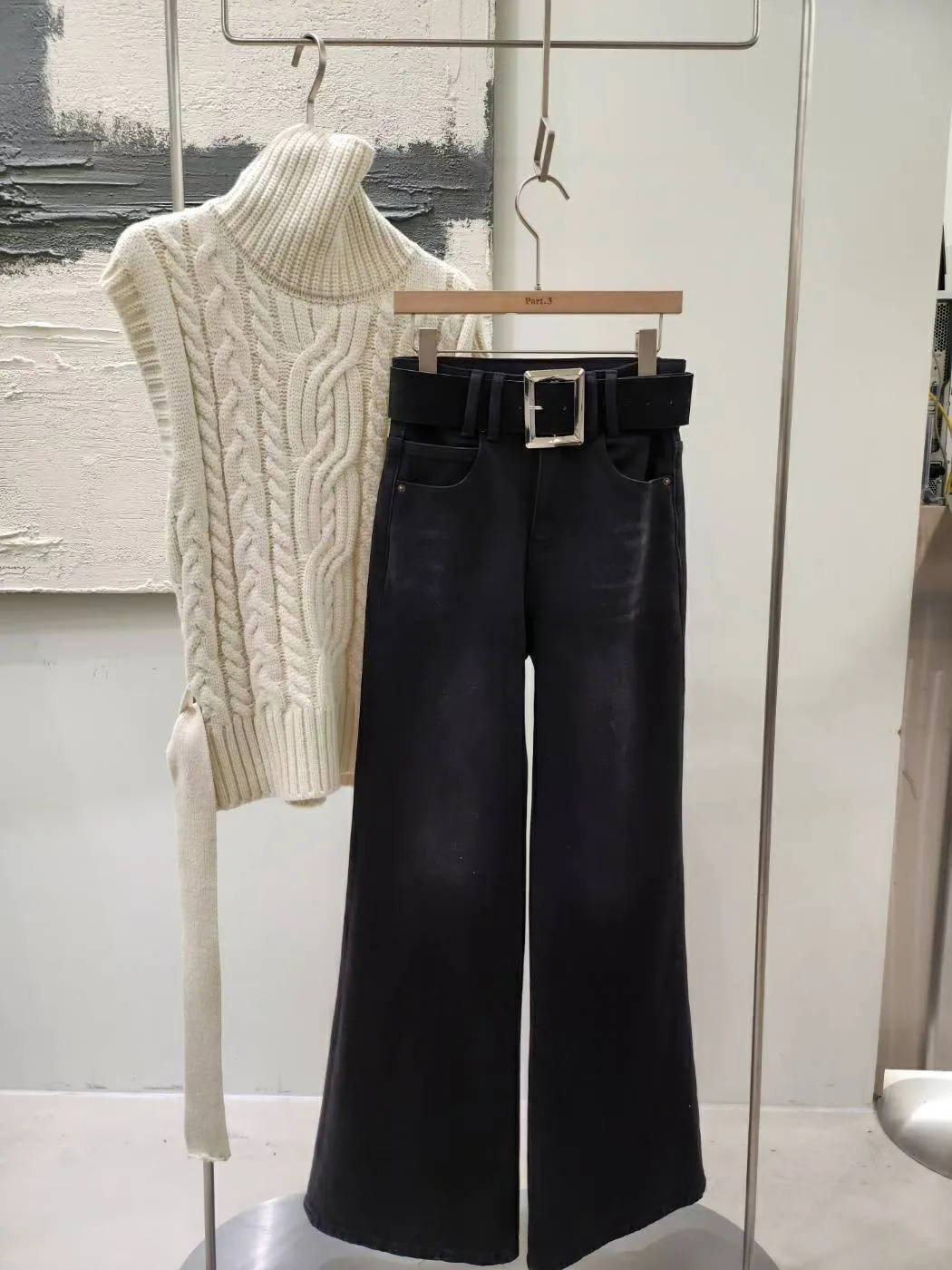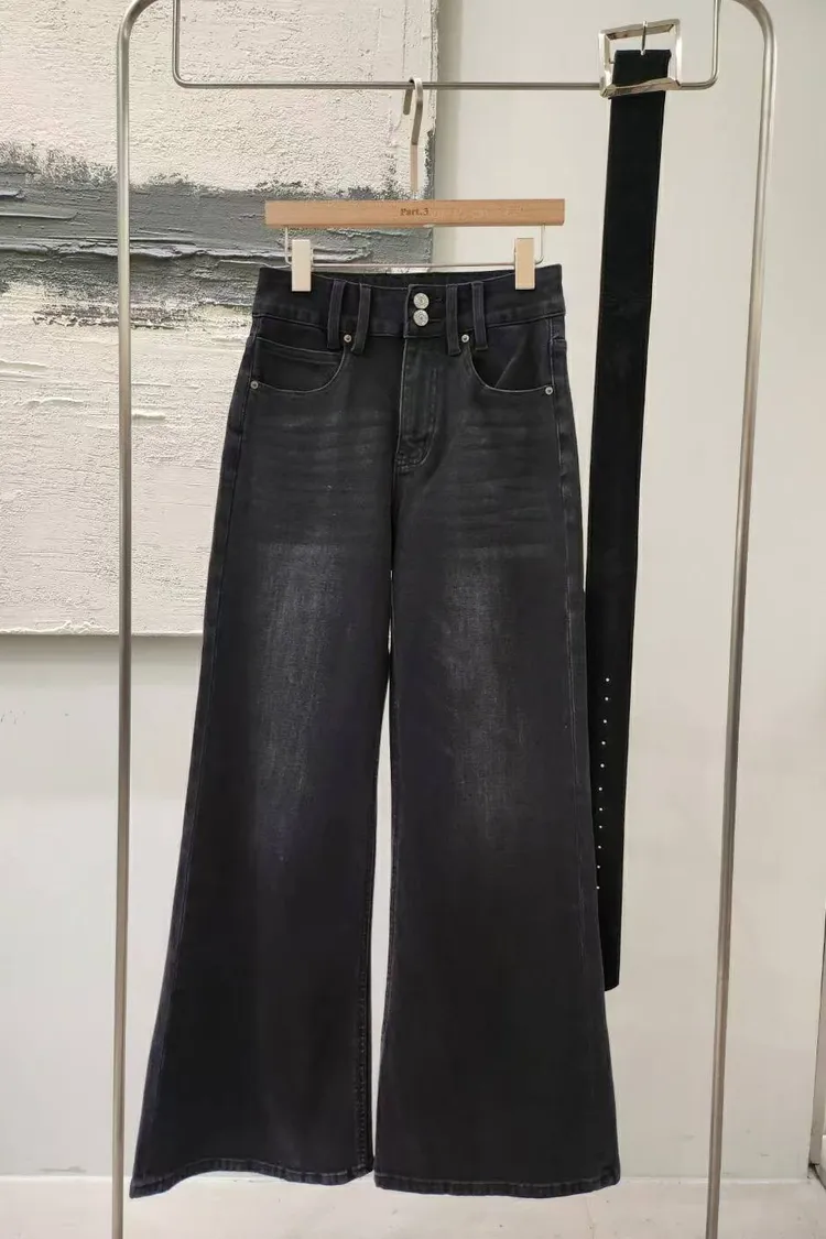正韓 微磨毛高腰牛仔闊腿褲 -附皮帶-