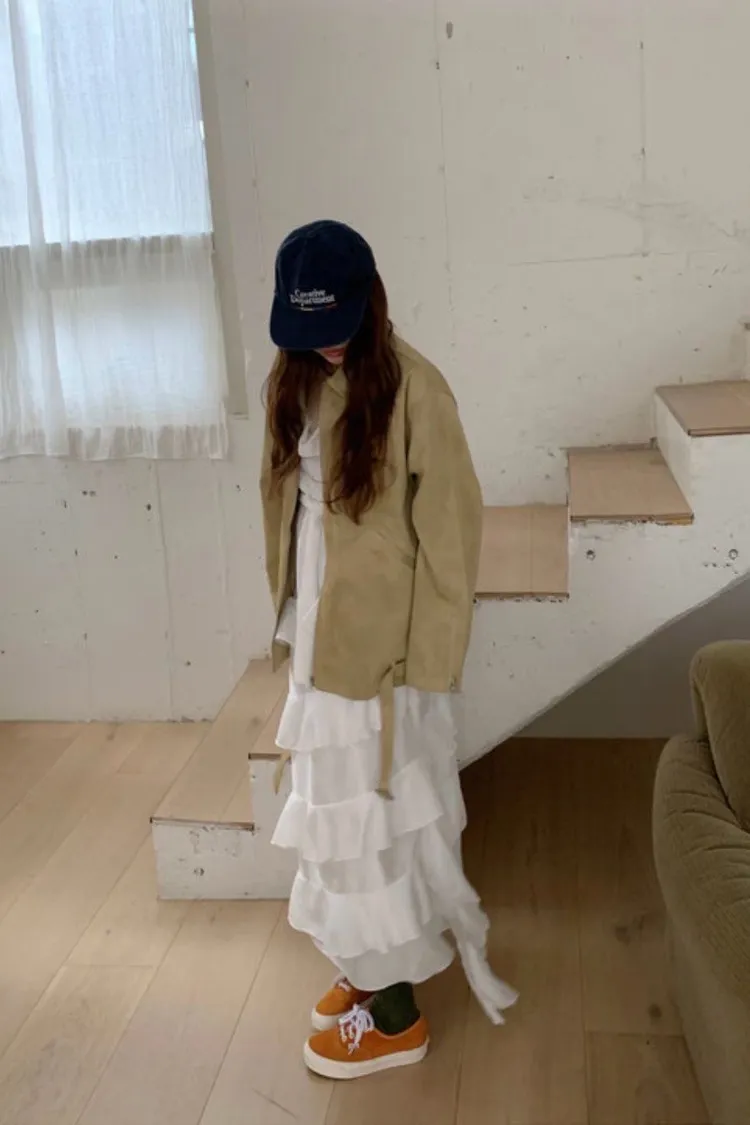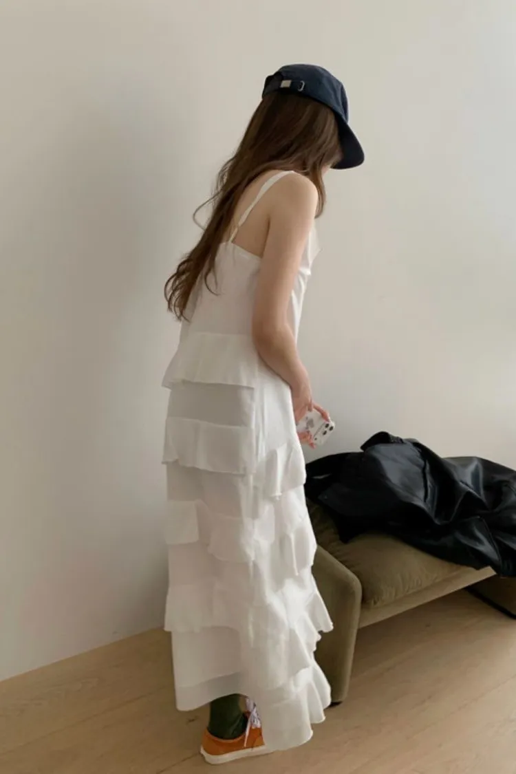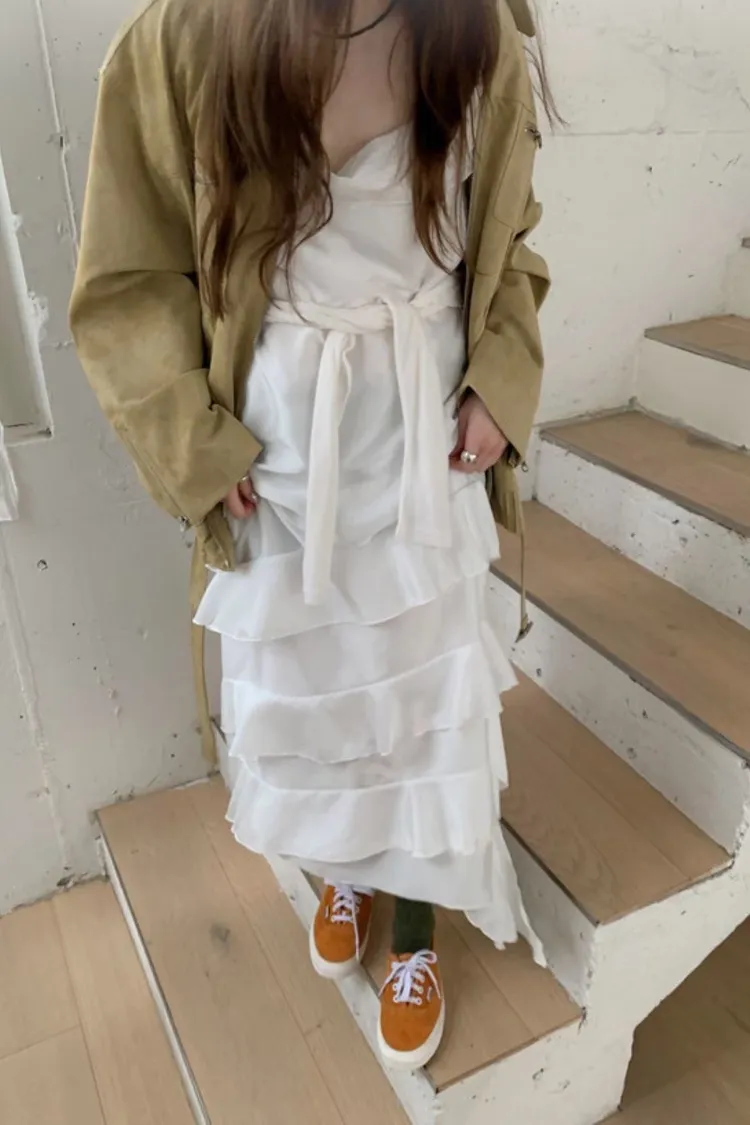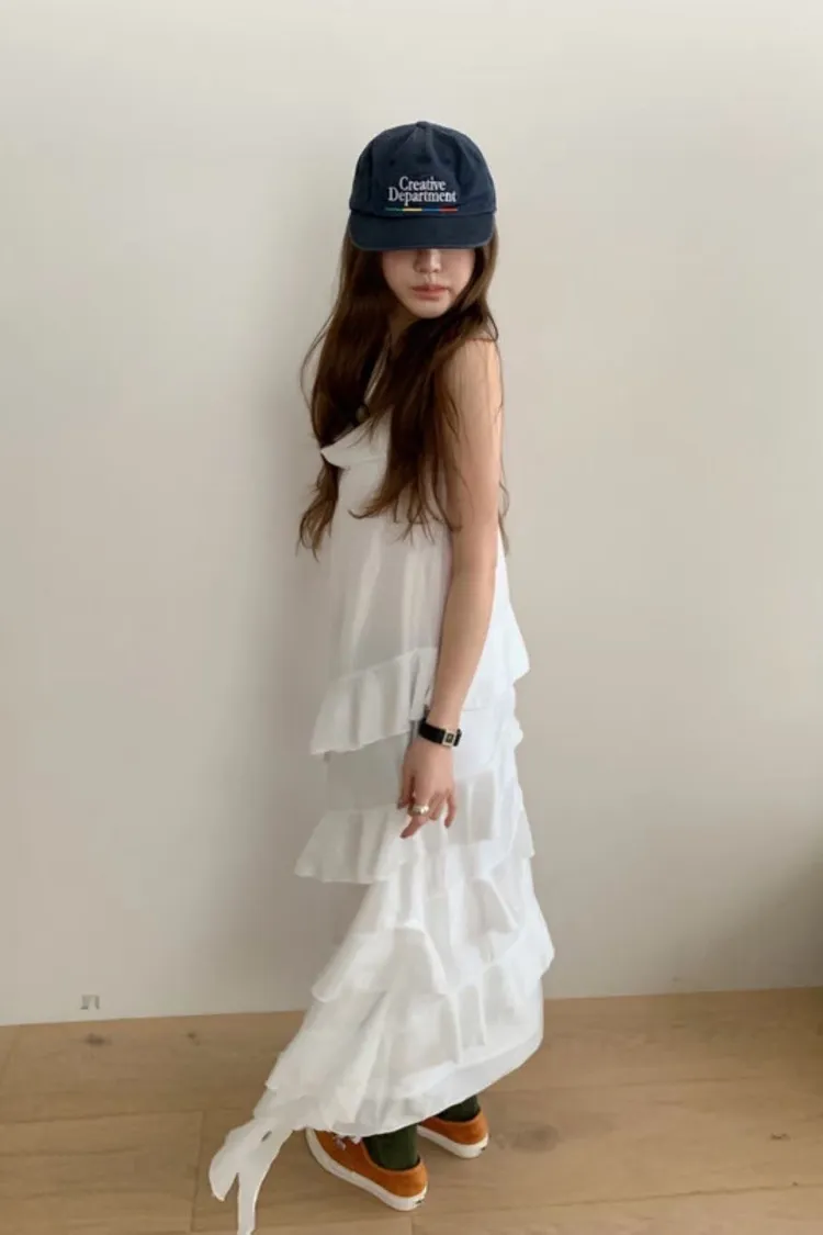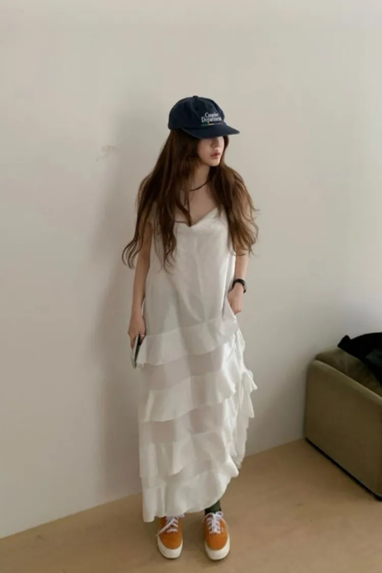 正韓 柔緞荷葉細肩洋裝
