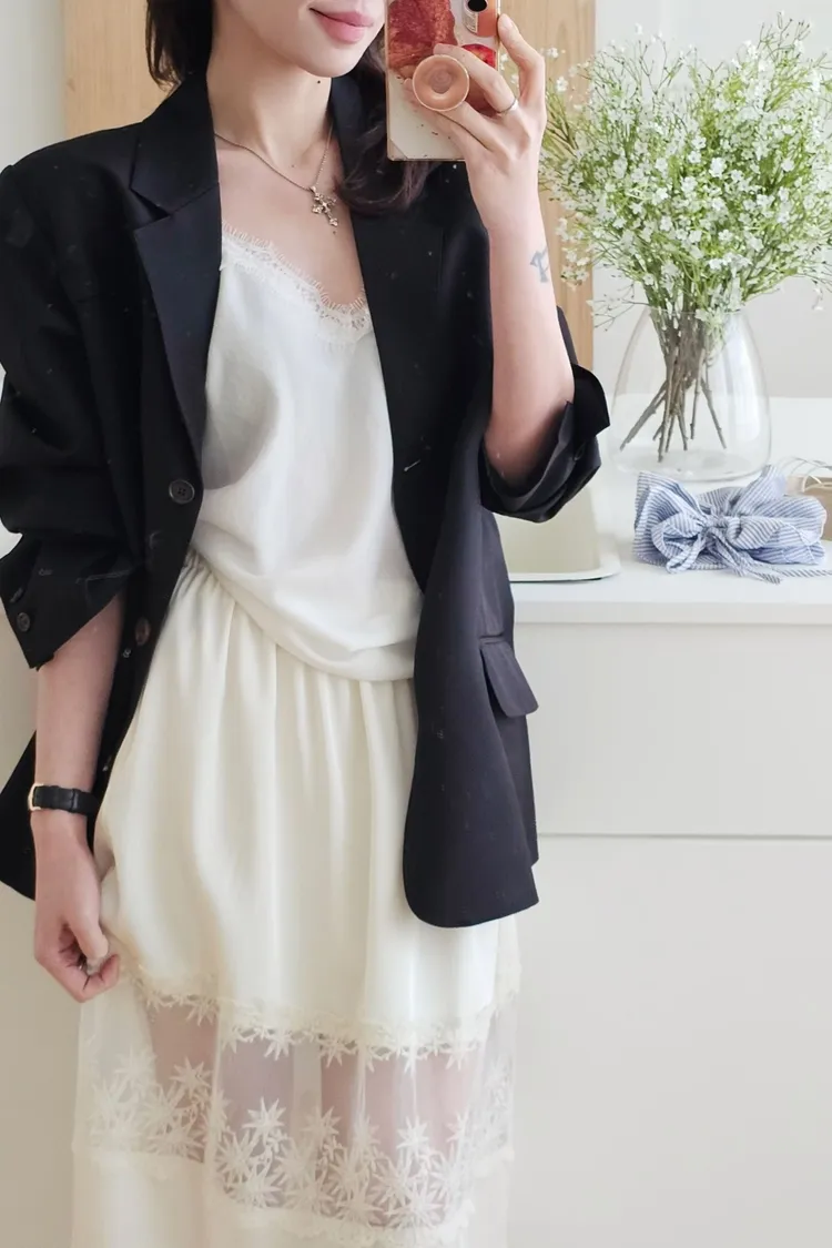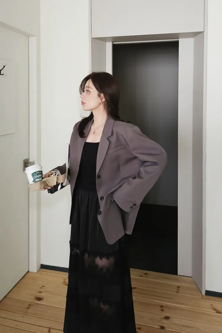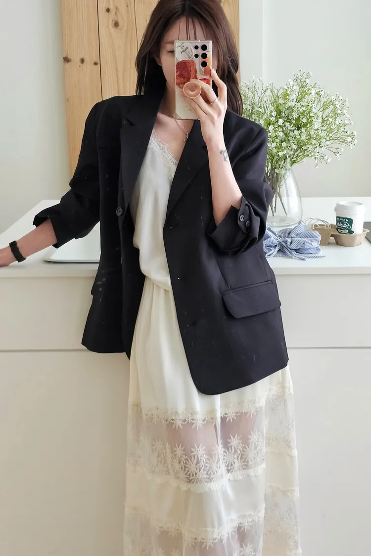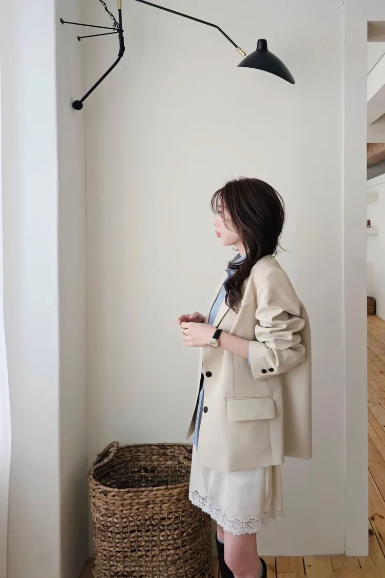 時髦精的廓形西裝外套+今年流行的蕾絲單品直接就是時髦法式女孩😎😎 非常淺的杏色提亮氣色高級感暗灰和經典黑色~ 觸感精緻高級 手感非常細緻面料薄而有挺度 輕盈不壓身👌 整件都有高質感全內裡,兩側口袋,極薄墊肩霧面琥珀釦~ 微寬版型 96%聚酯+4%彈性