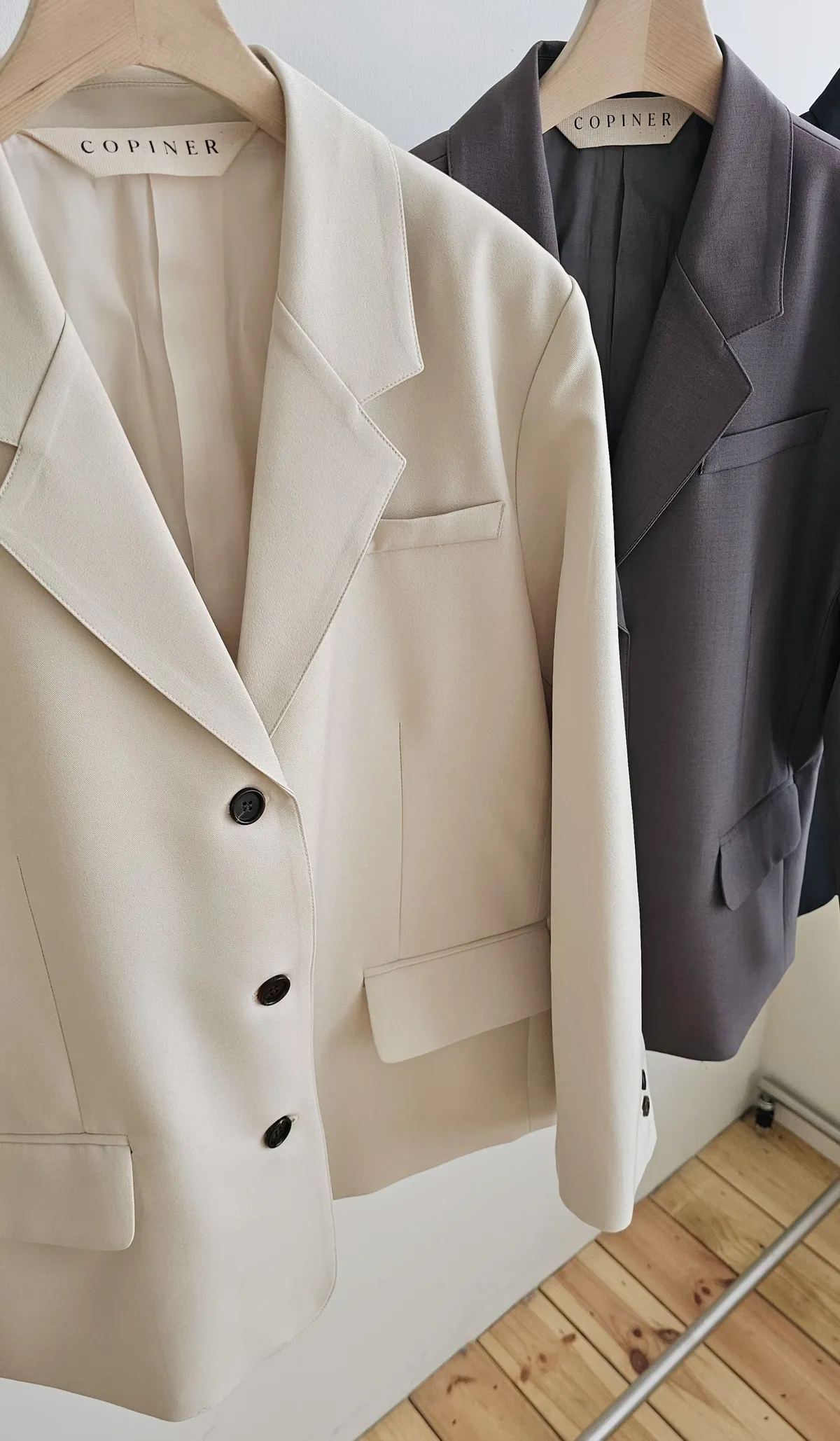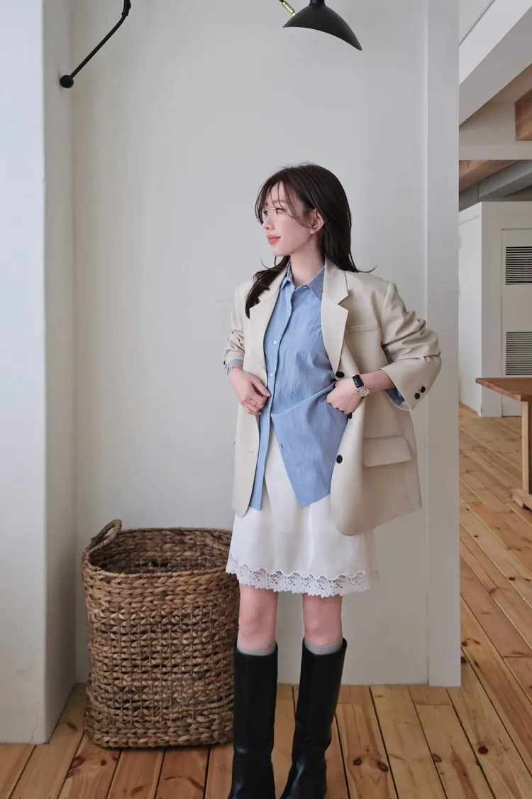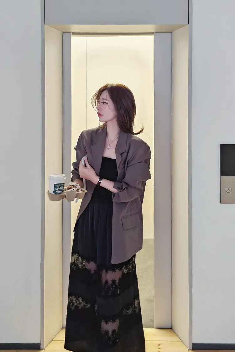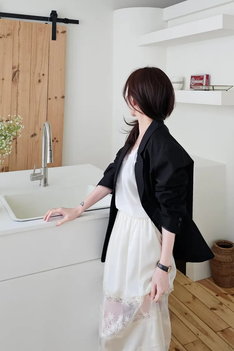 時髦精的廓形西裝外套+今年流行的蕾絲單品直接就是時髦法式女孩😎😎 非常淺的杏色提亮氣色高級感暗灰和經典黑色~ 觸感精緻高級 手感非常細緻面料薄而有挺度 輕盈不壓身👌 整件都有高質感全內裡,兩側口袋,極薄墊肩霧面琥珀釦~ 微寬版型 96%聚酯+4%彈性
