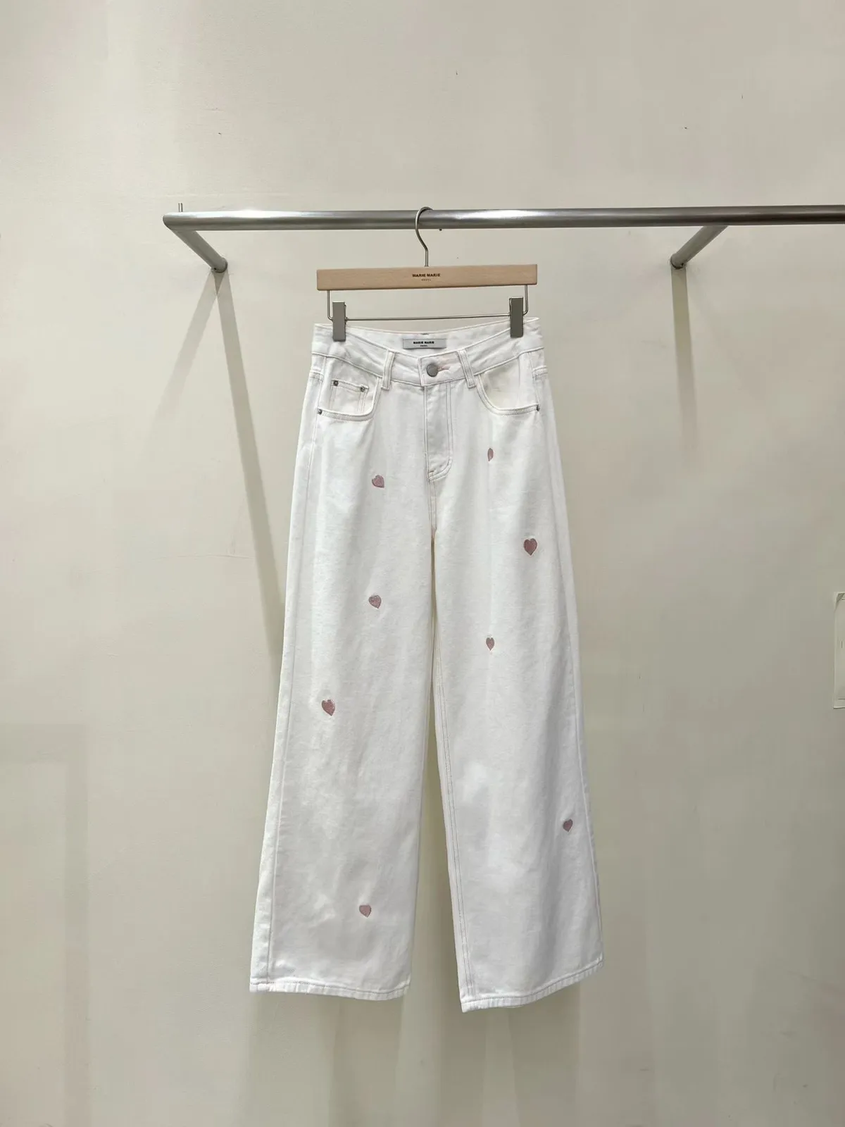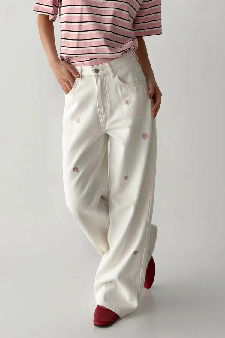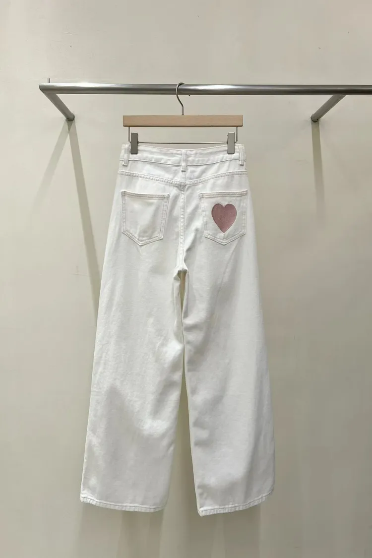 正韓 粉嫩愛心刺繡高腰牛仔褲