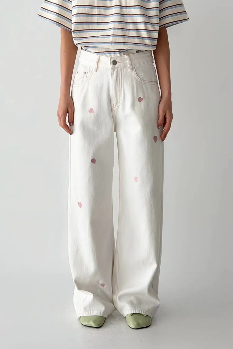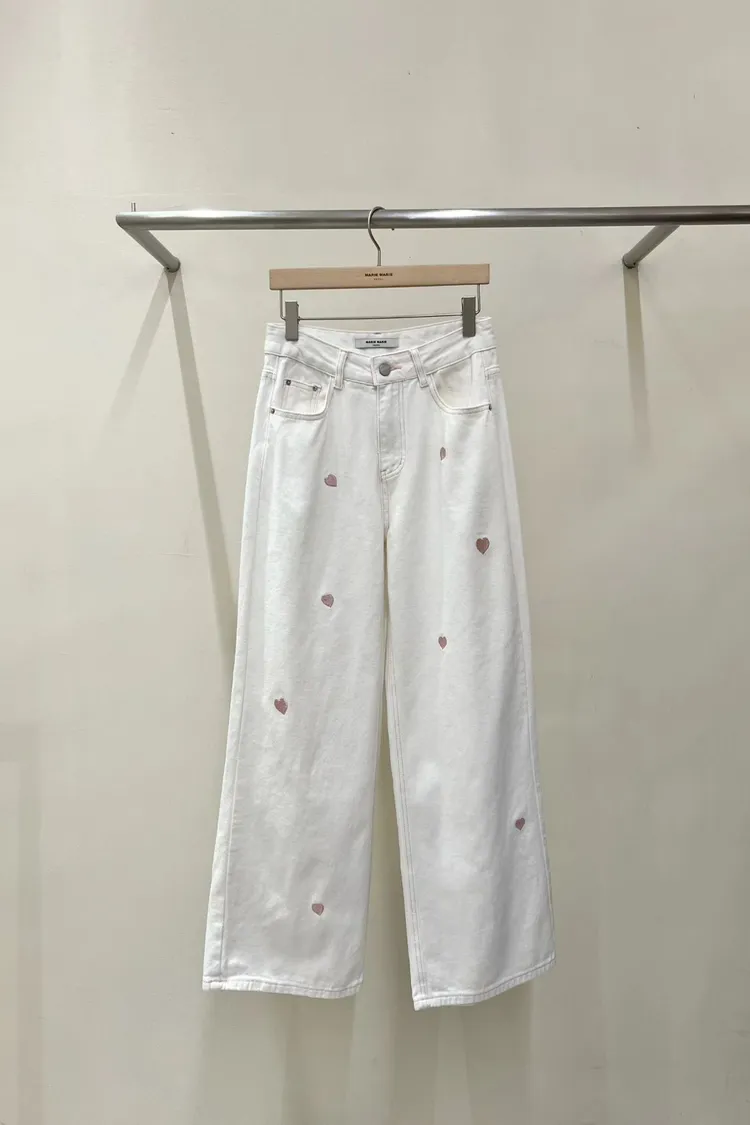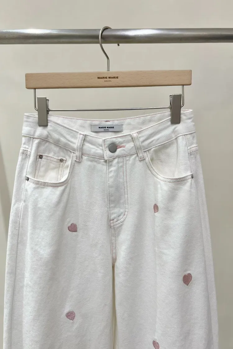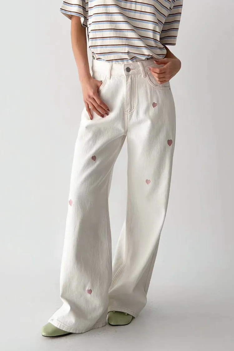 正韓 粉嫩愛心刺繡高腰牛仔褲