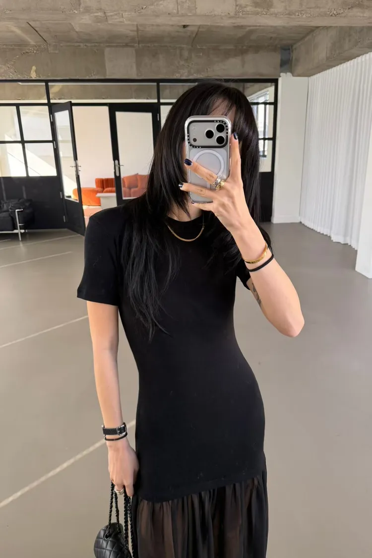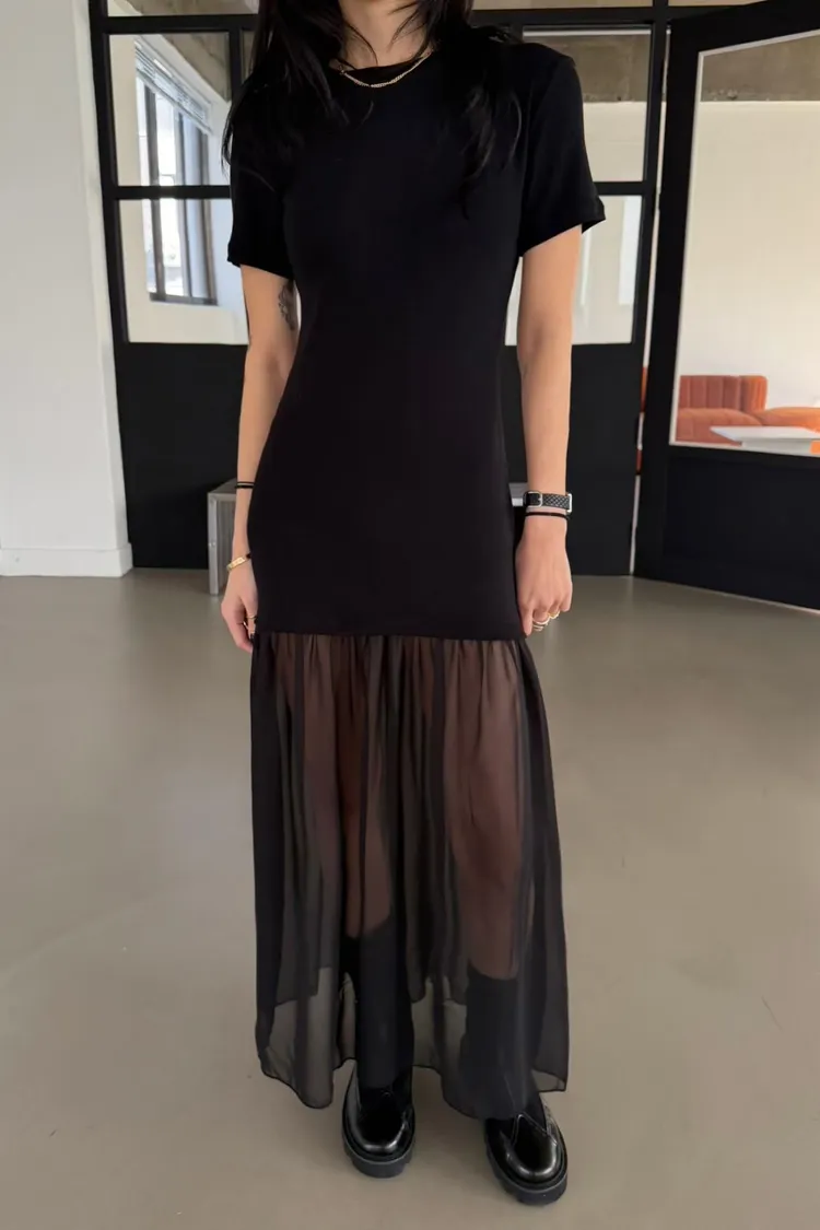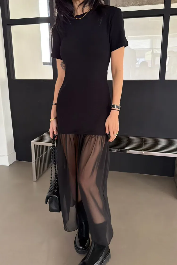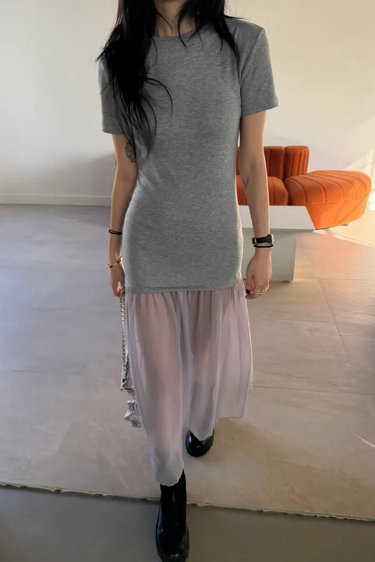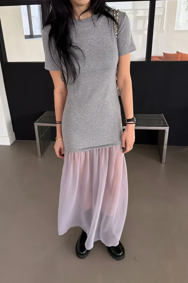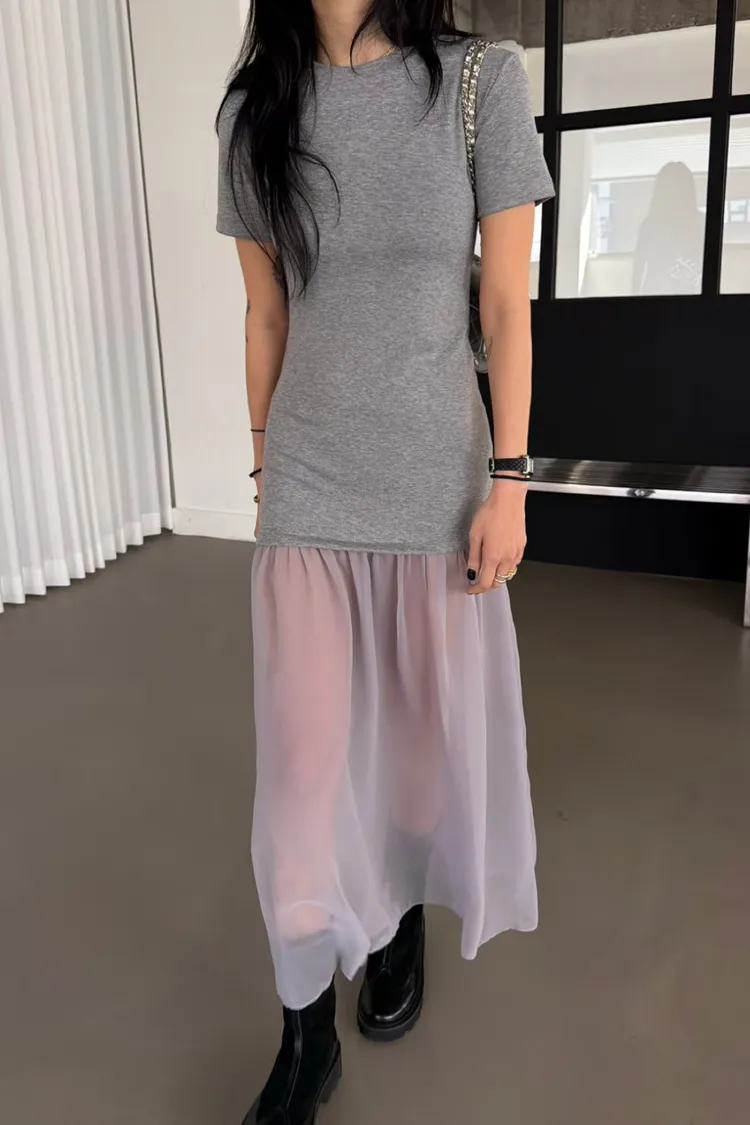 正韓 微辣拼接紗短袖長洋裝