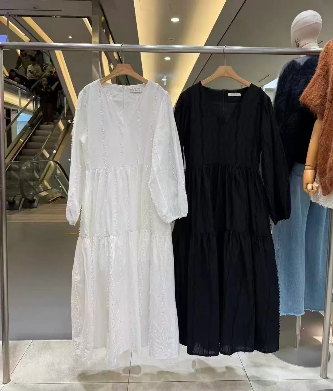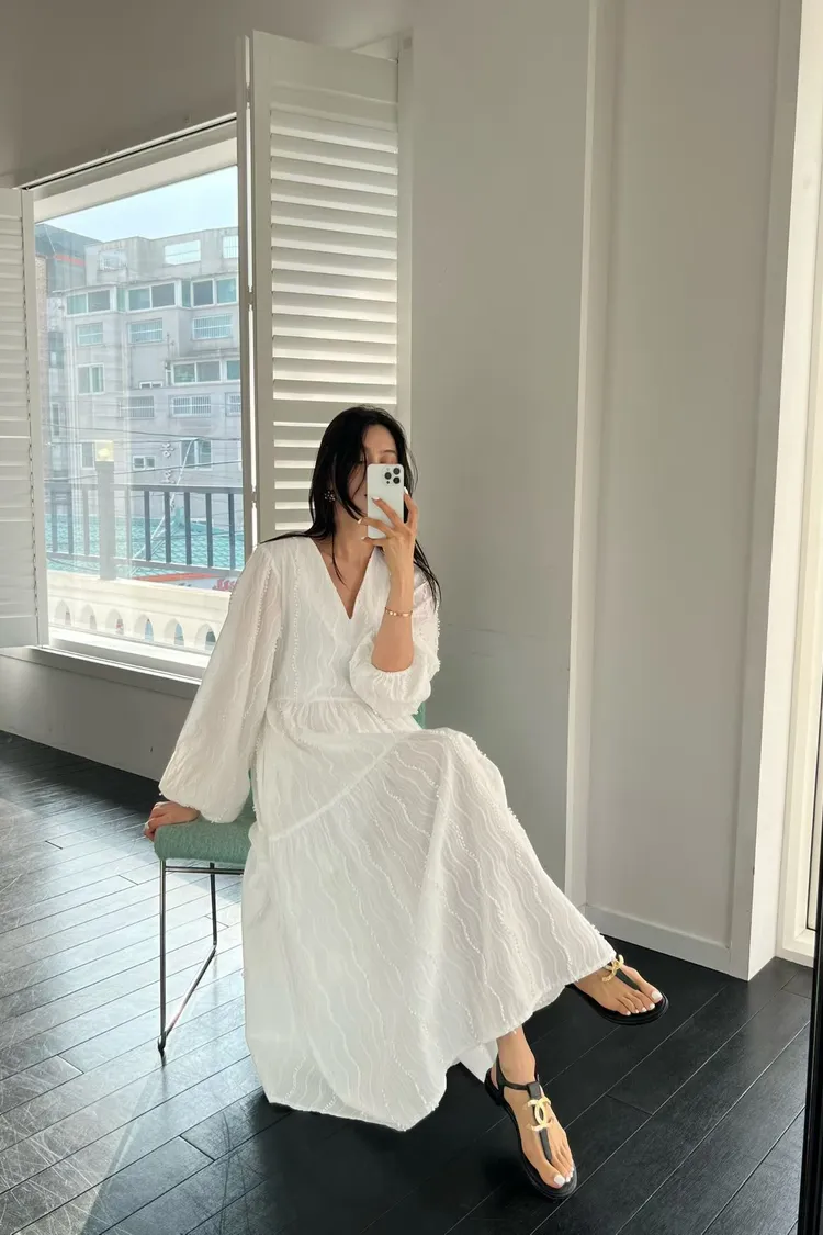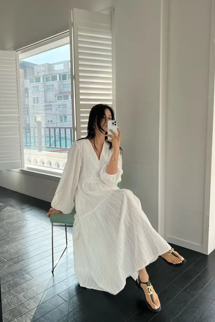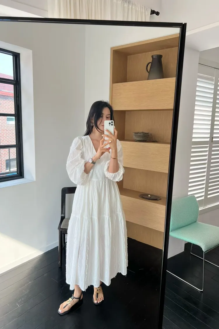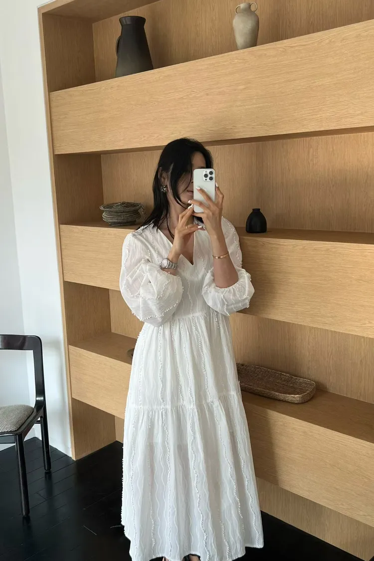 正韓 細緻繡線V領長洋裝