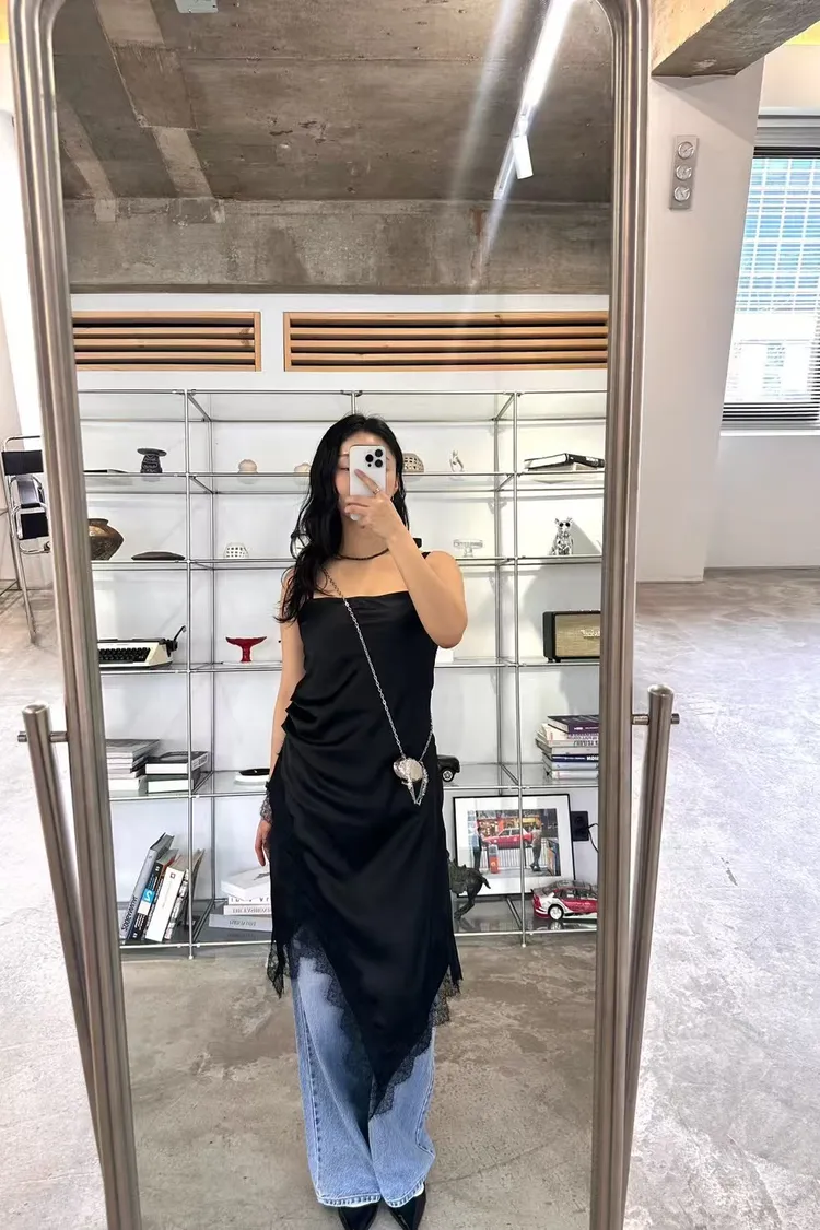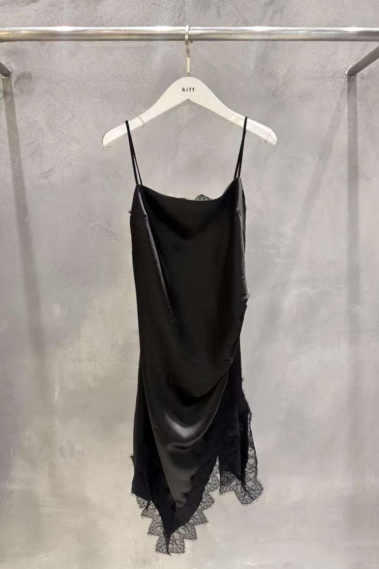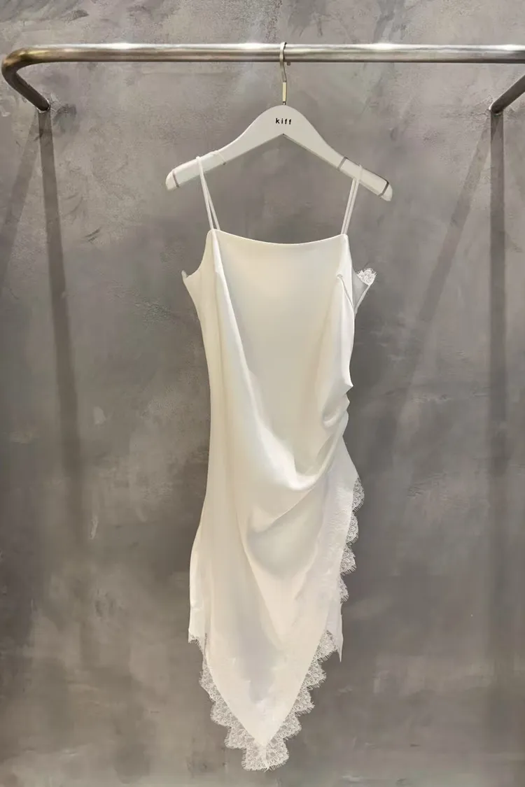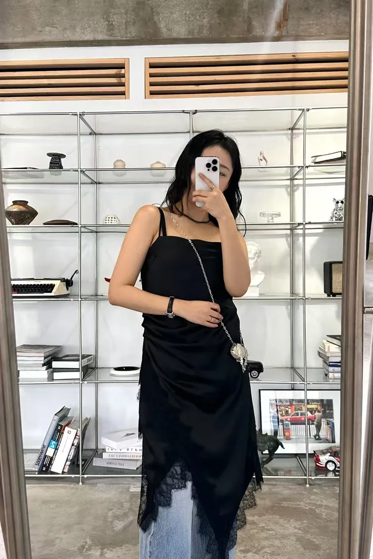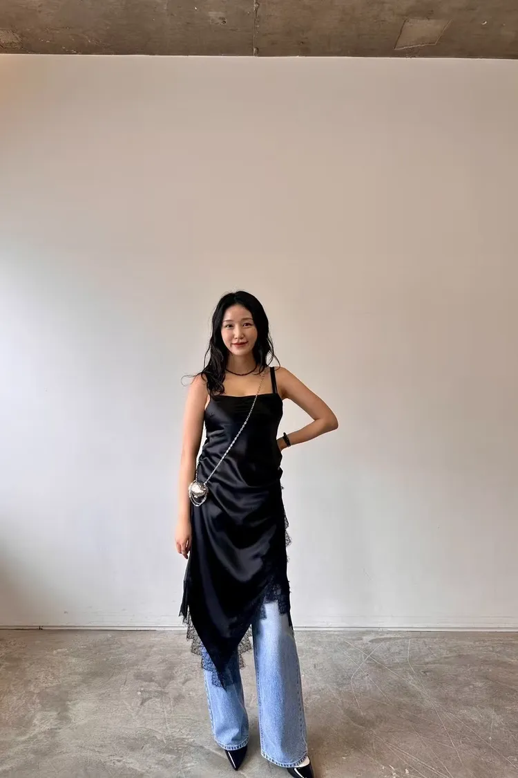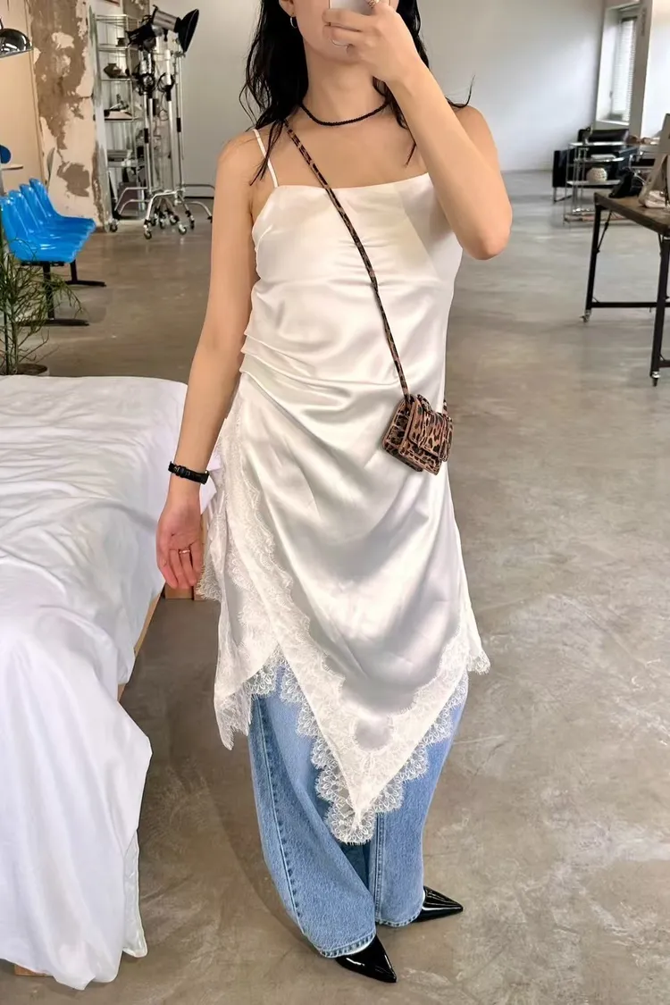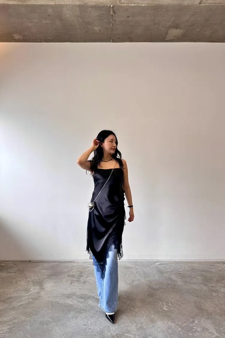 正韓 睫毛蕾絲開衩細肩洋裝
