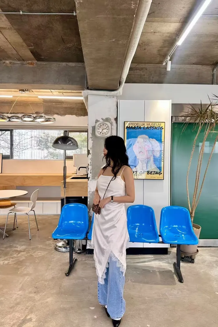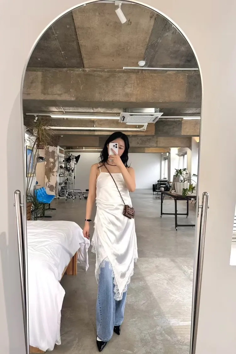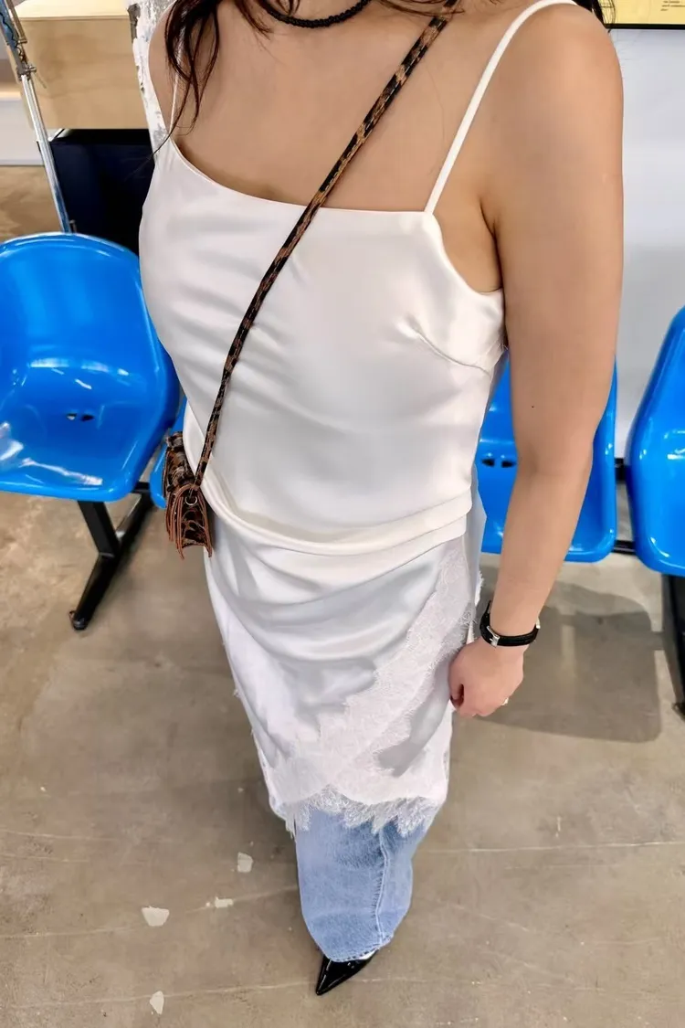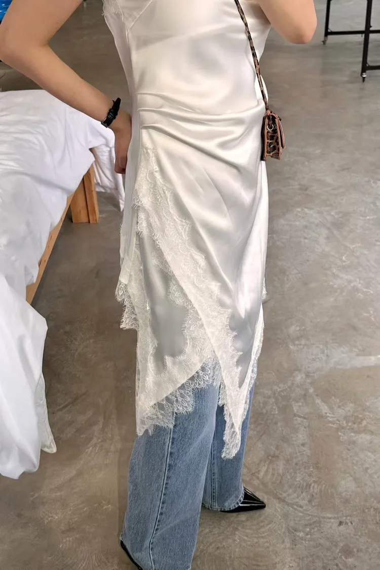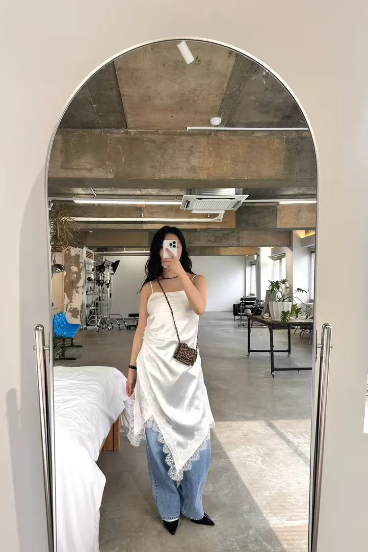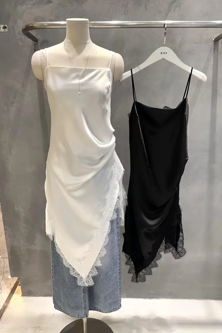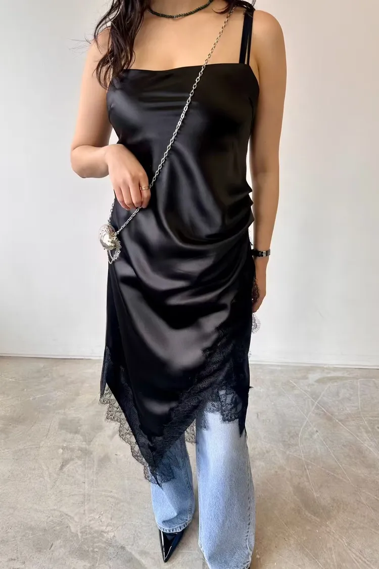 正韓 睫毛蕾絲開衩細肩洋裝