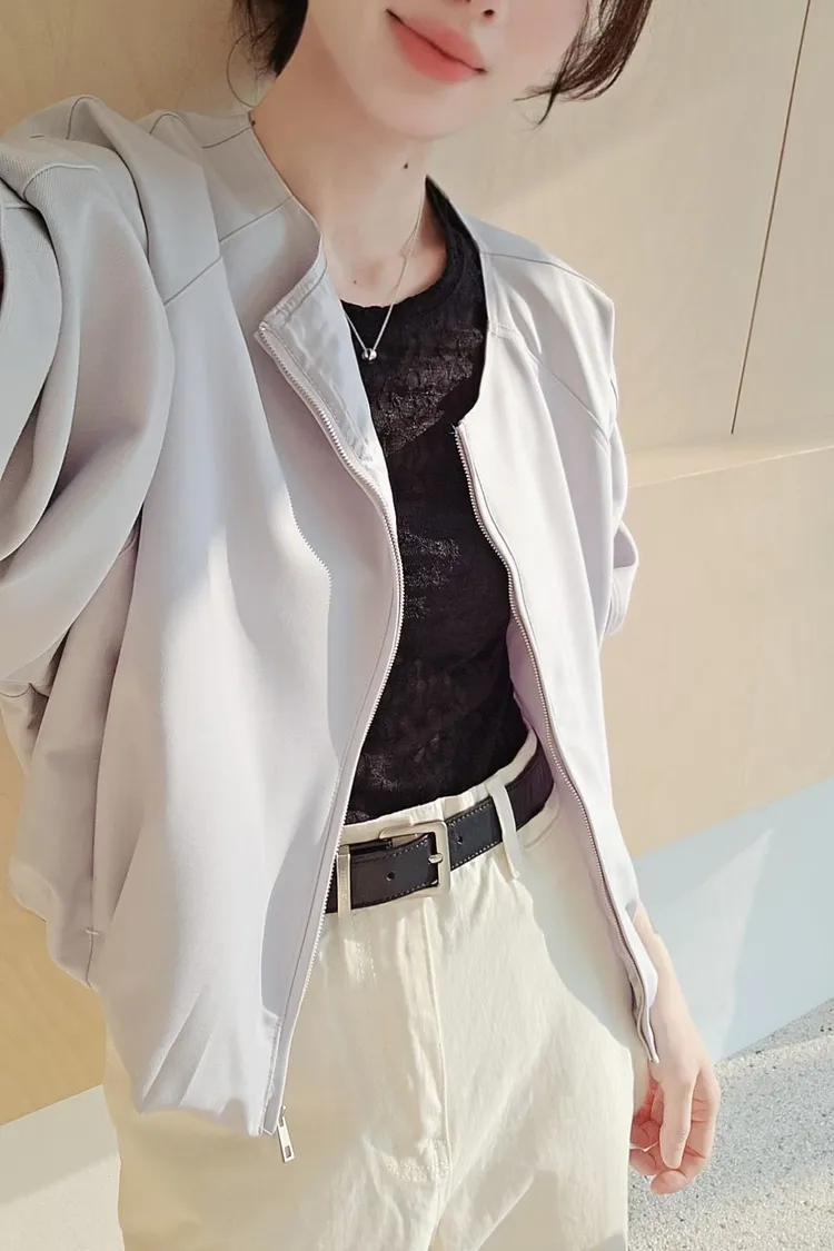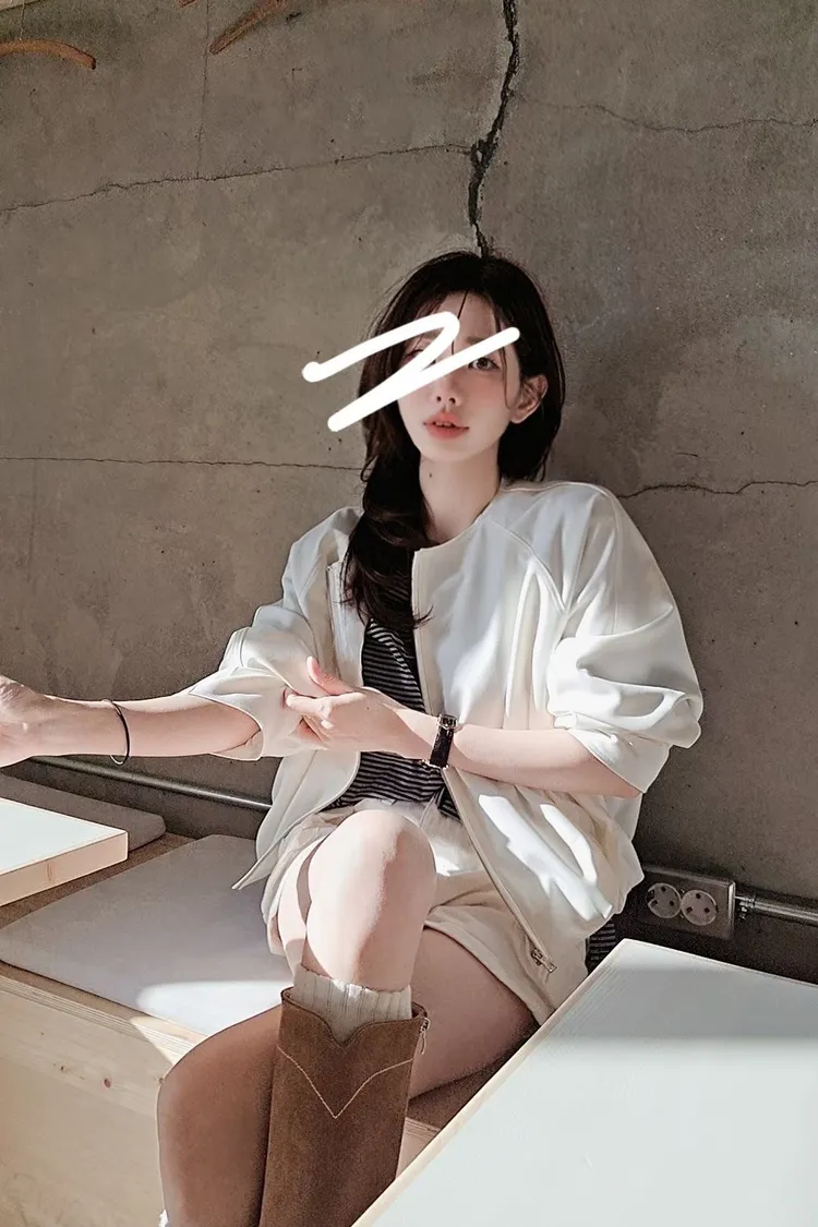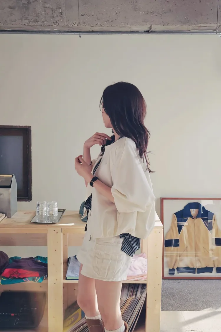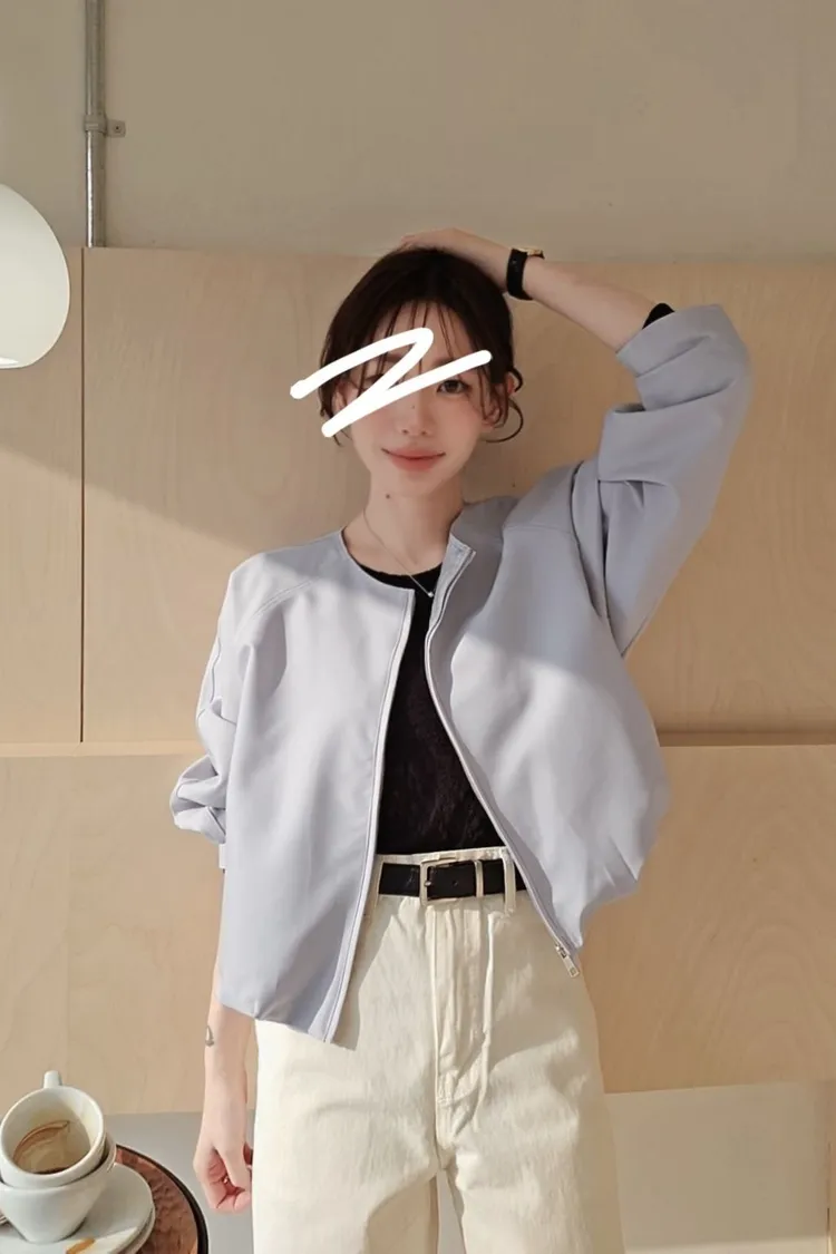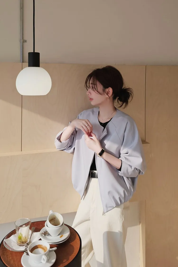 清新感奶乎乎的一款質感薄夾克🧊🌿牛奶白和帶一點灰度低飽和淺藍色調下擺的打摺花苞線條很漂亮鬆弛感和細膩氣質一次到位✨ 薄款面料,觸感柔滑細緻,垂感很美的一款高質感全內裡,兩側隱形口袋 休閒修身版型 78%聚酯+16%人造絲+6%彈性 onni搭配🩰奶油短褲