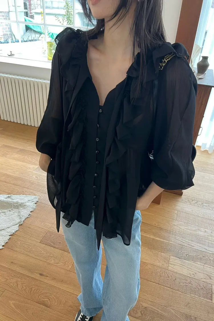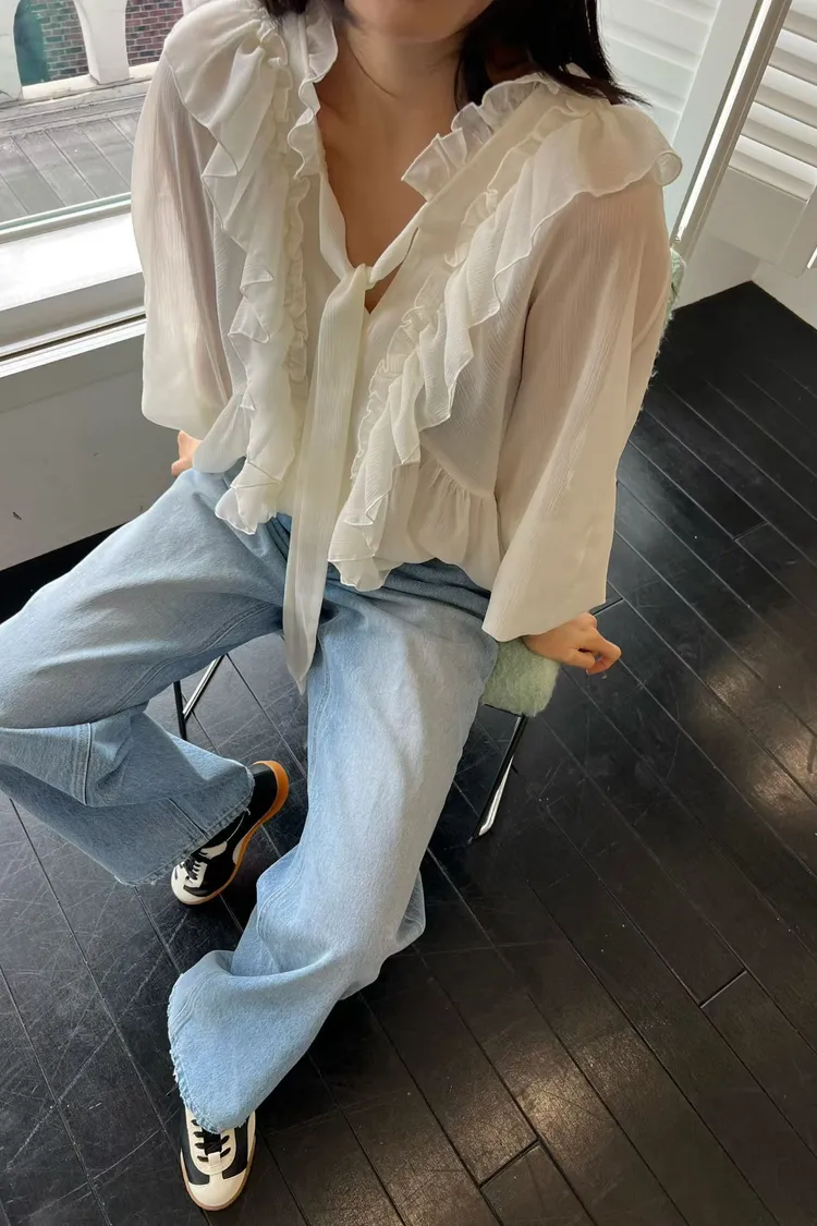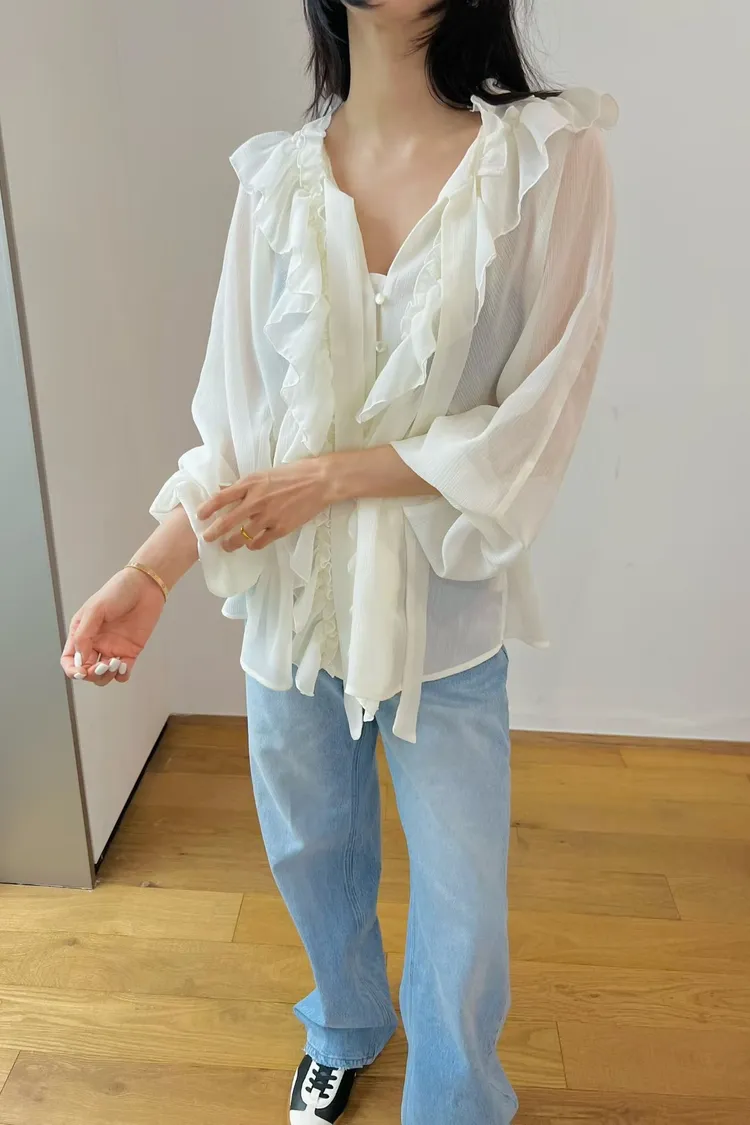 正韓 洋溢荷葉雪紡上衣