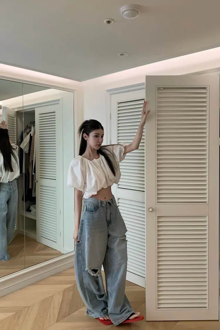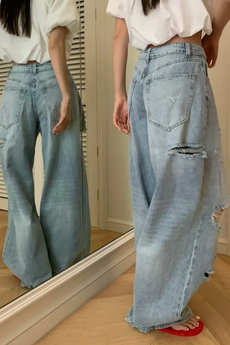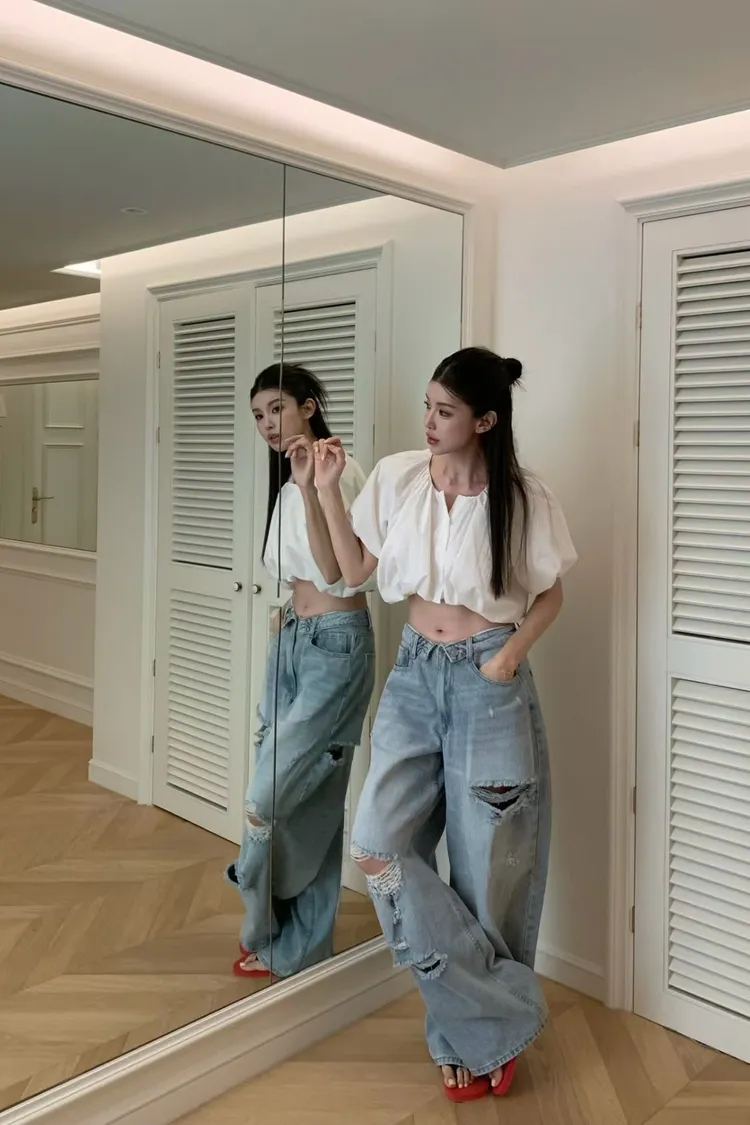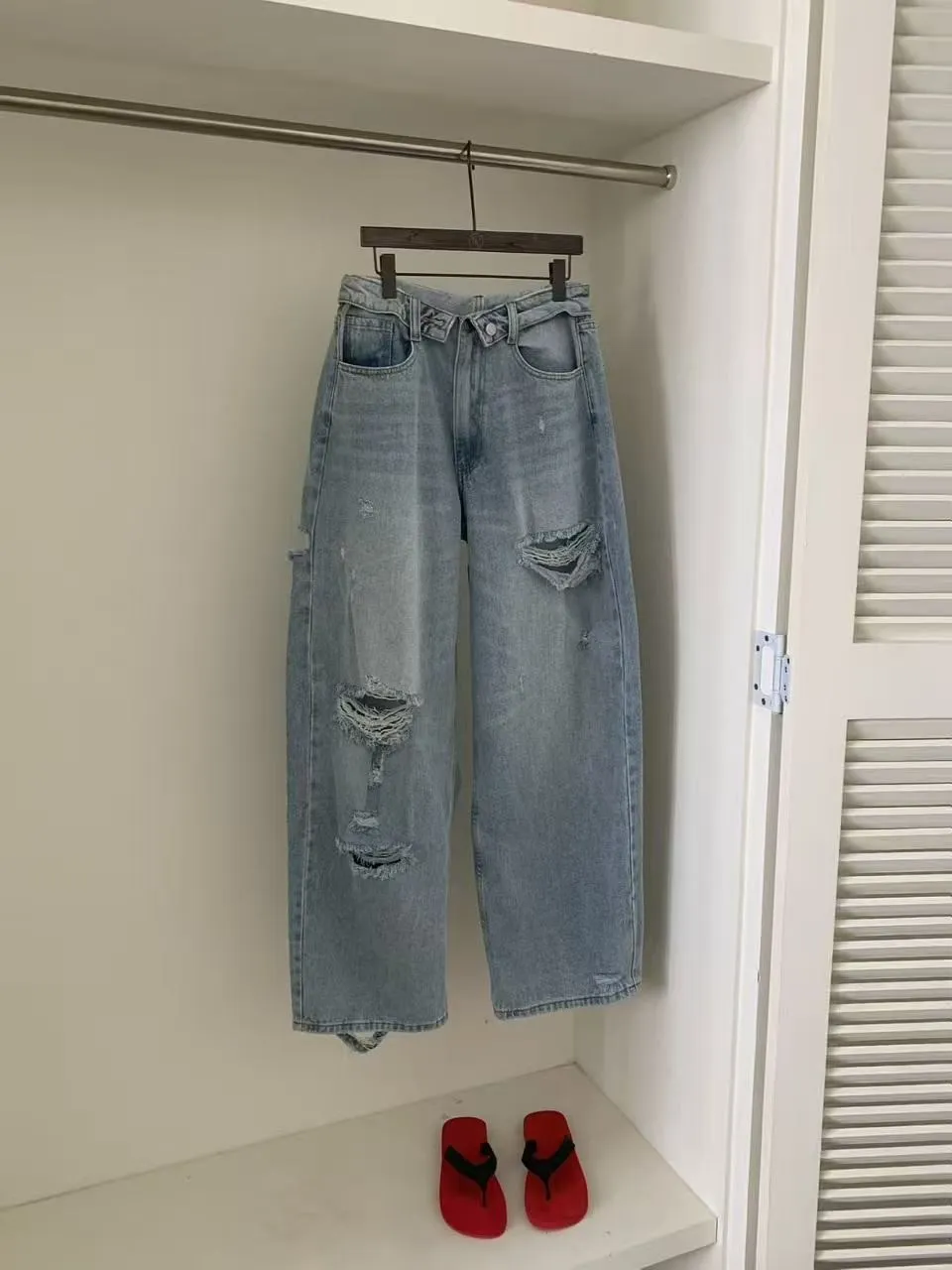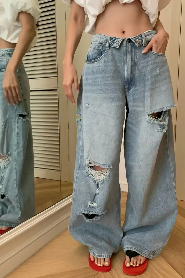 正韓 好帥!反摺褲頭刷破褲